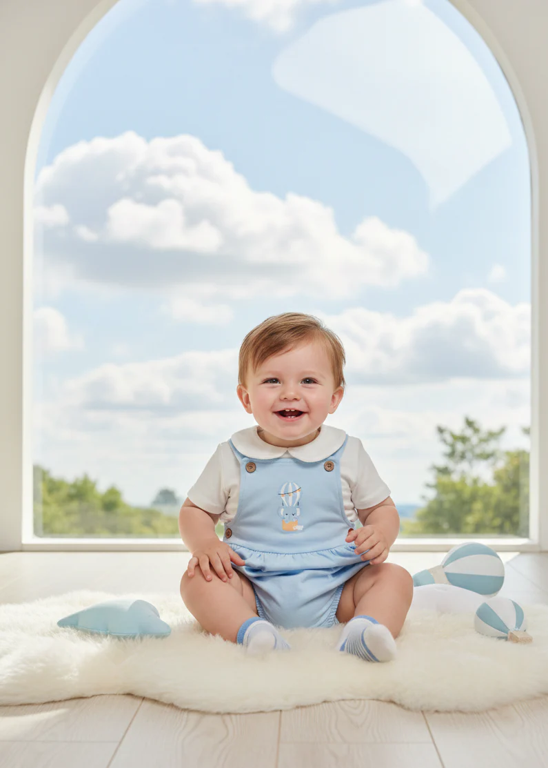 Conjunto de dos piezas para bebé niño de 1 a 24 meses. Camiseta en color crudo con cuello bebé y estampado central de globo aerostático. Ranita en azul celeste con tirantes cruzados y botones decorativos. Un look cómodo y fresco para los días de verano.