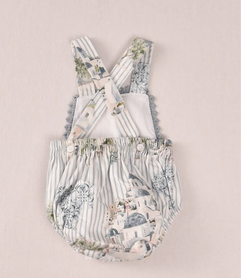 Ranita «Amanecer en Santorini» Encantadora ranita de estilo clásico con un delicado estampado de paisajes mediterráneos y rayas celestes. Confeccionada en algodón suave, destaca por su pechera decorada con encaje de bolillo y su cómodo diseño tipo bombacho. Perfecta para que los más pequeños luzcan elegantes y frescos en sus días de paseo.