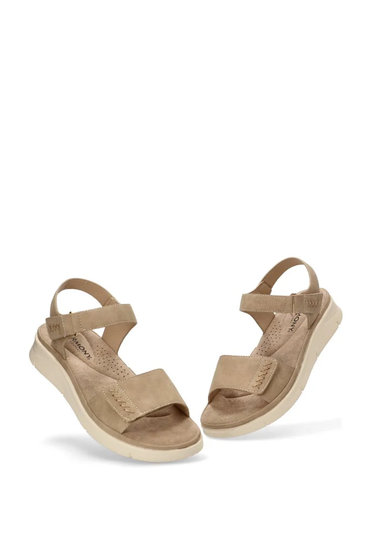 ¿Buscas unas sandalias cómodas, bonitas y con un toque especial para tus dÃas de sol? Las Sandalias Velcro ARMONY TEGUISE en color taupe son la elección perfecta. Su diseño con velcro y su cuña media las hacen ideales para cualquier look casual de verano.