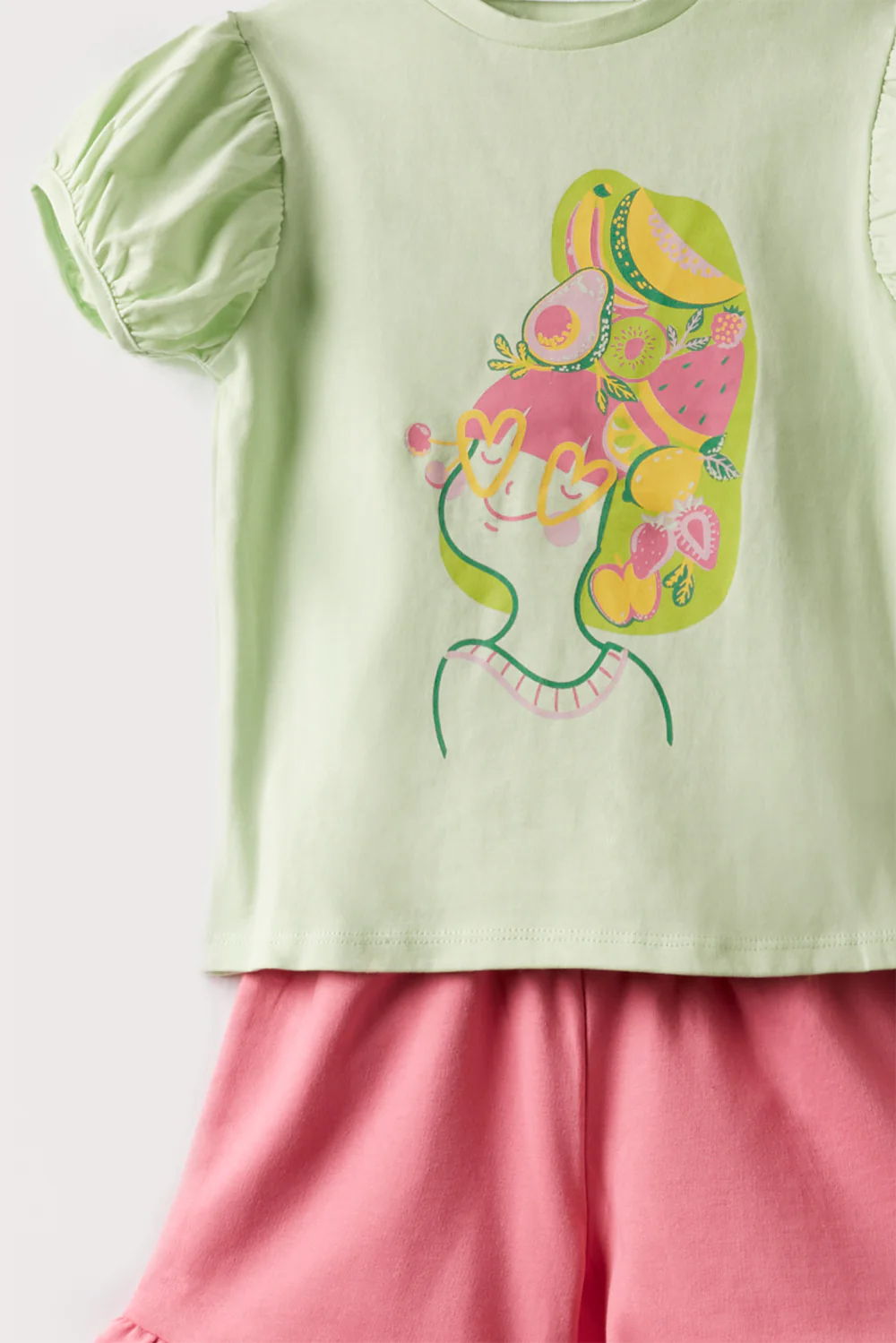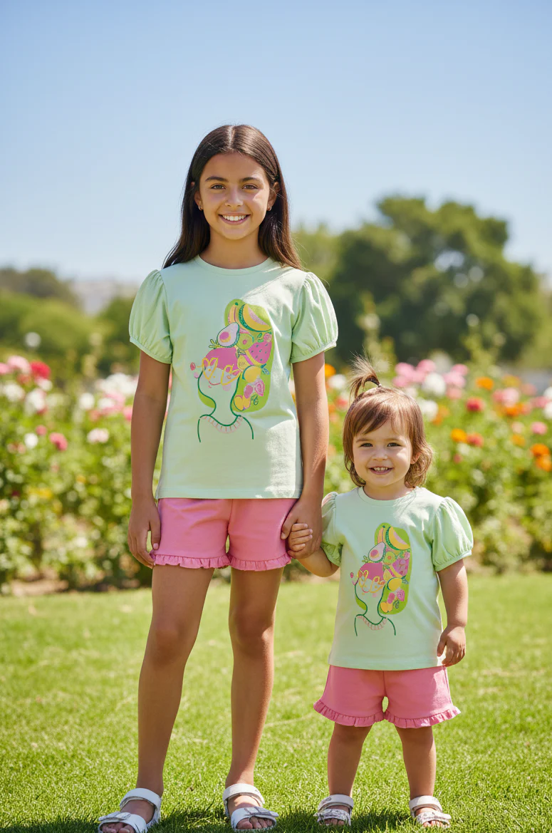 Conjunto short de color fucsia y camiseta verde claro, para bebe y niña