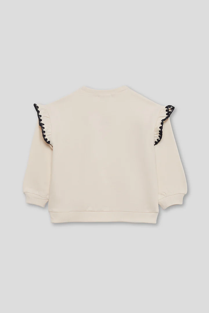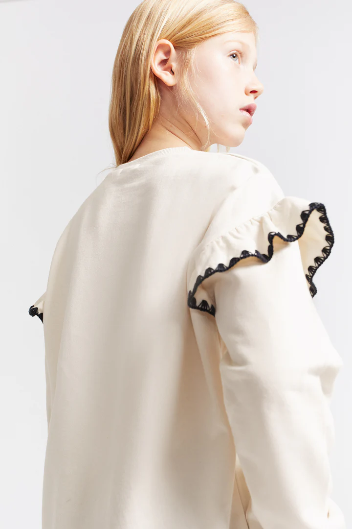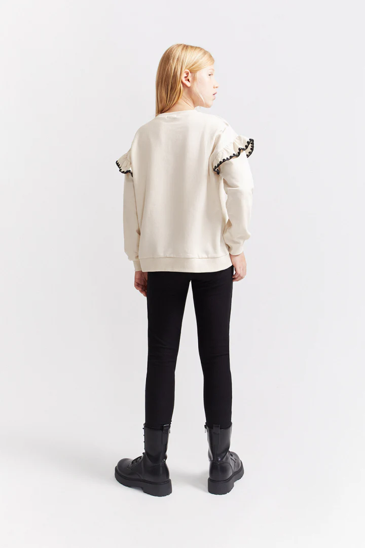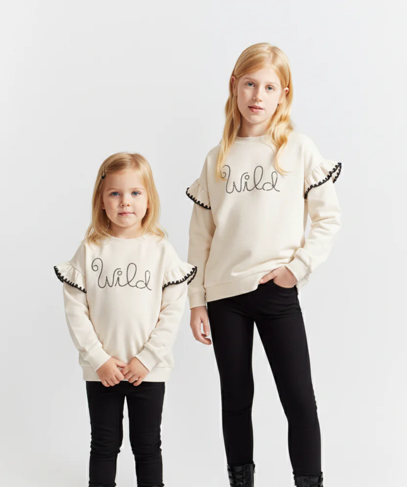 💚Sudadera de niña disponible en color blanco roto, en tallas de 2 a 16 años. Sudadera de manga larga en tejido de felpa suave con cuello redondo y puños de canalé. Presenta volantes en los hombros decorados con cinta de encaje negra y detalle frontal con la palabra «Wild» bordada con pequeñas lentejuelas negras. Un diseño original y cómodo para añadir un toque especial a sus looks diarios.💚