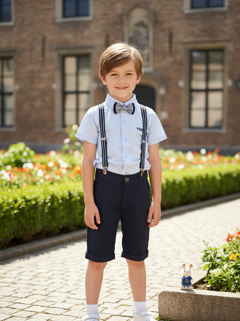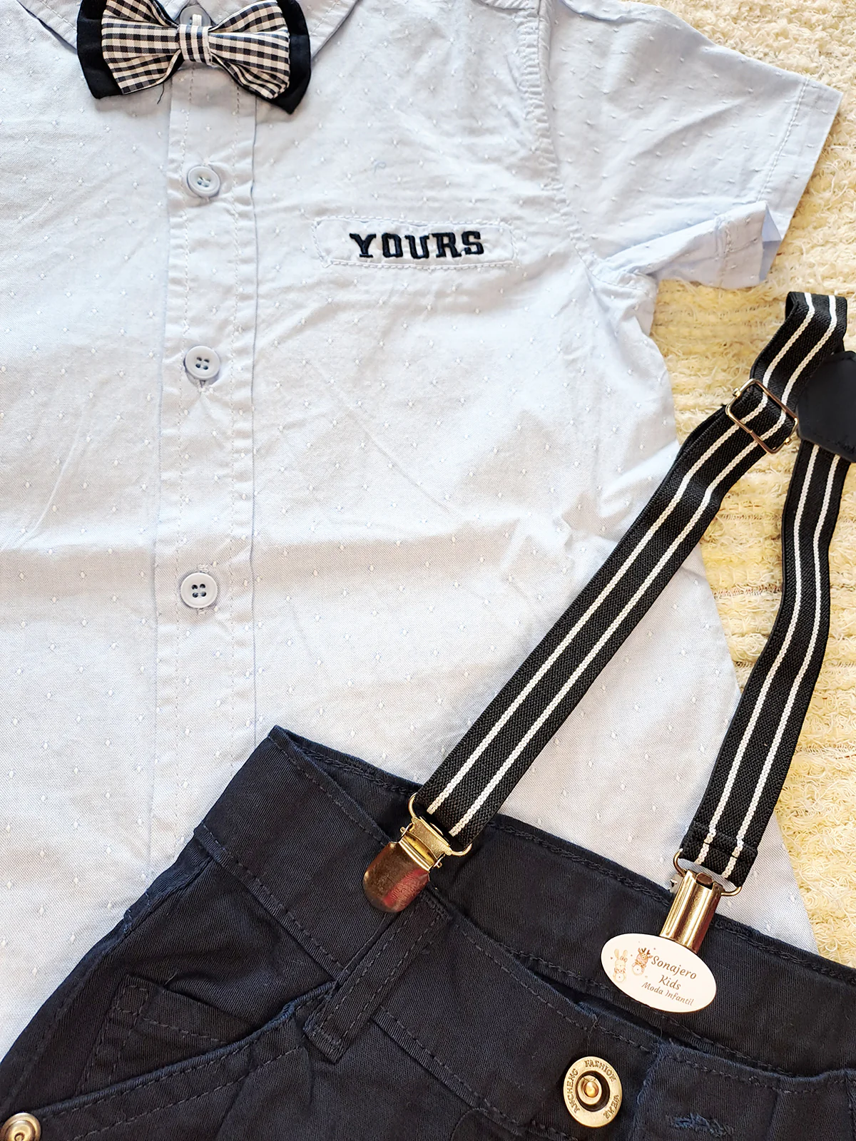 😉 Este conjunto de camisa y pantalón corto se vuelve único gracias a una original pajarita y tirantes.