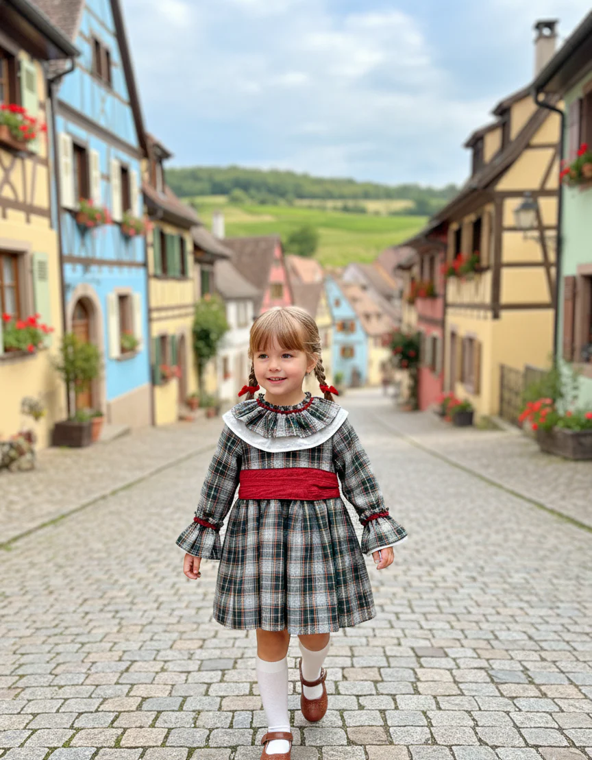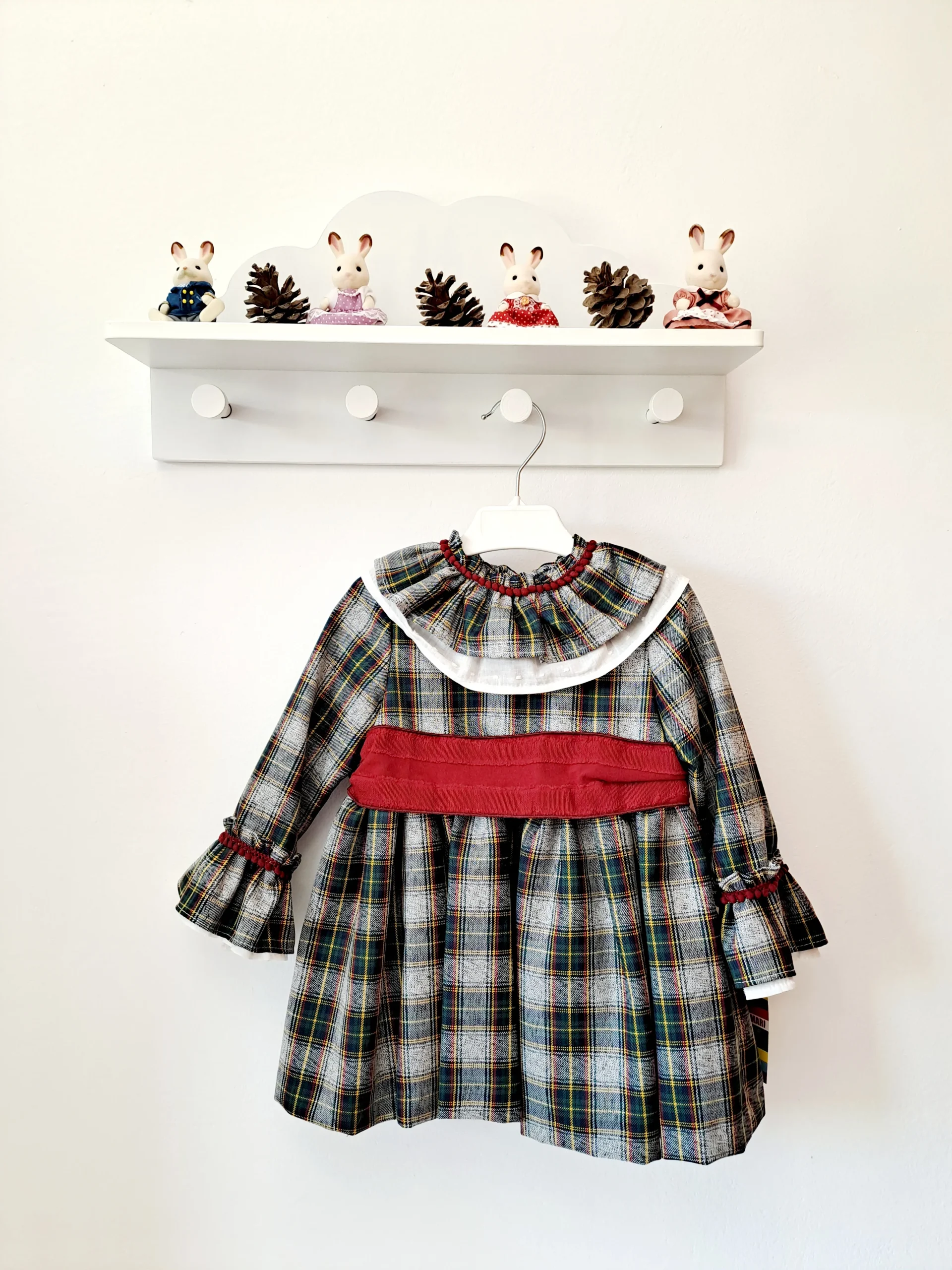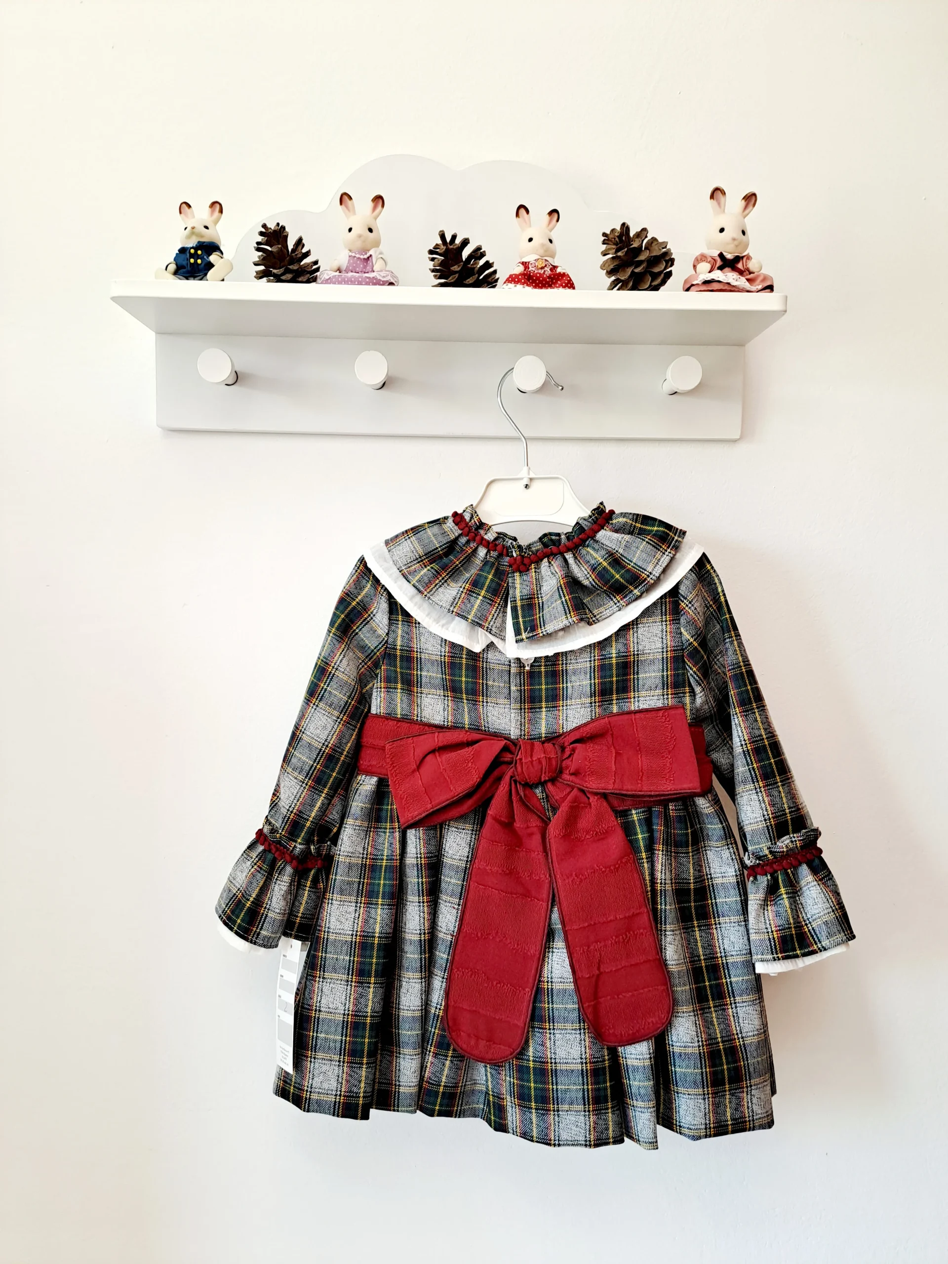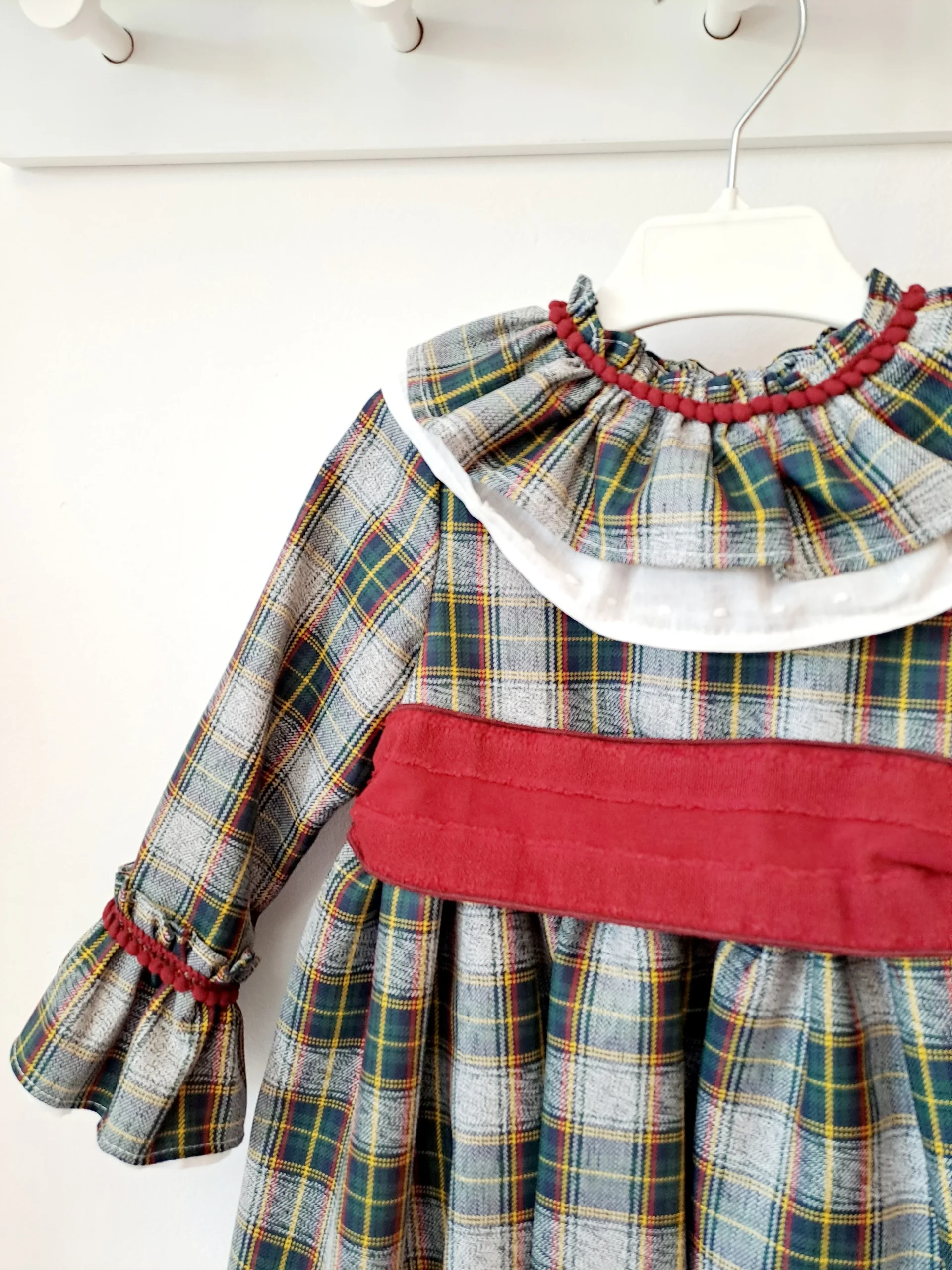 Vestido de cuadros con cinturón bourdeos con volante en los cuello.