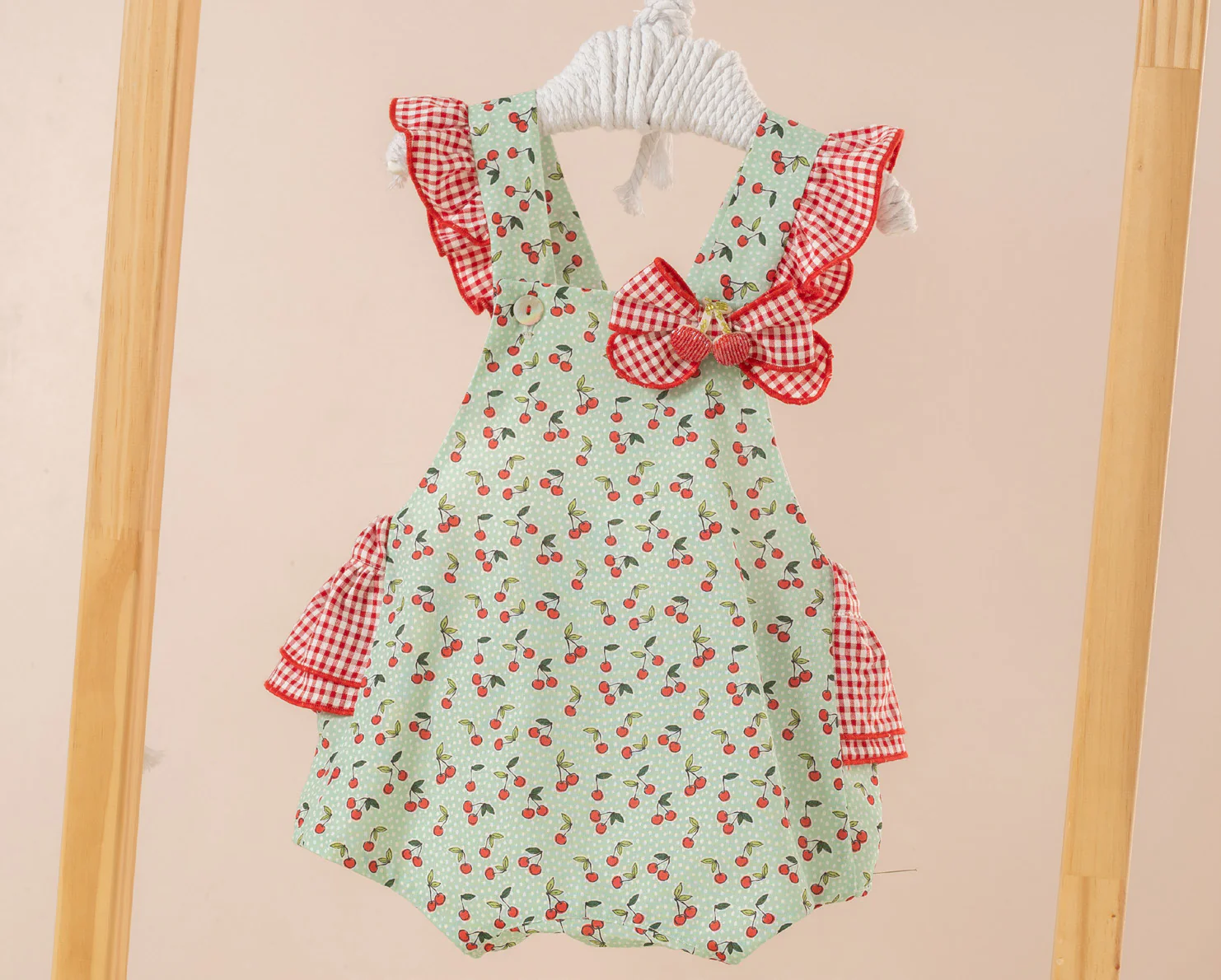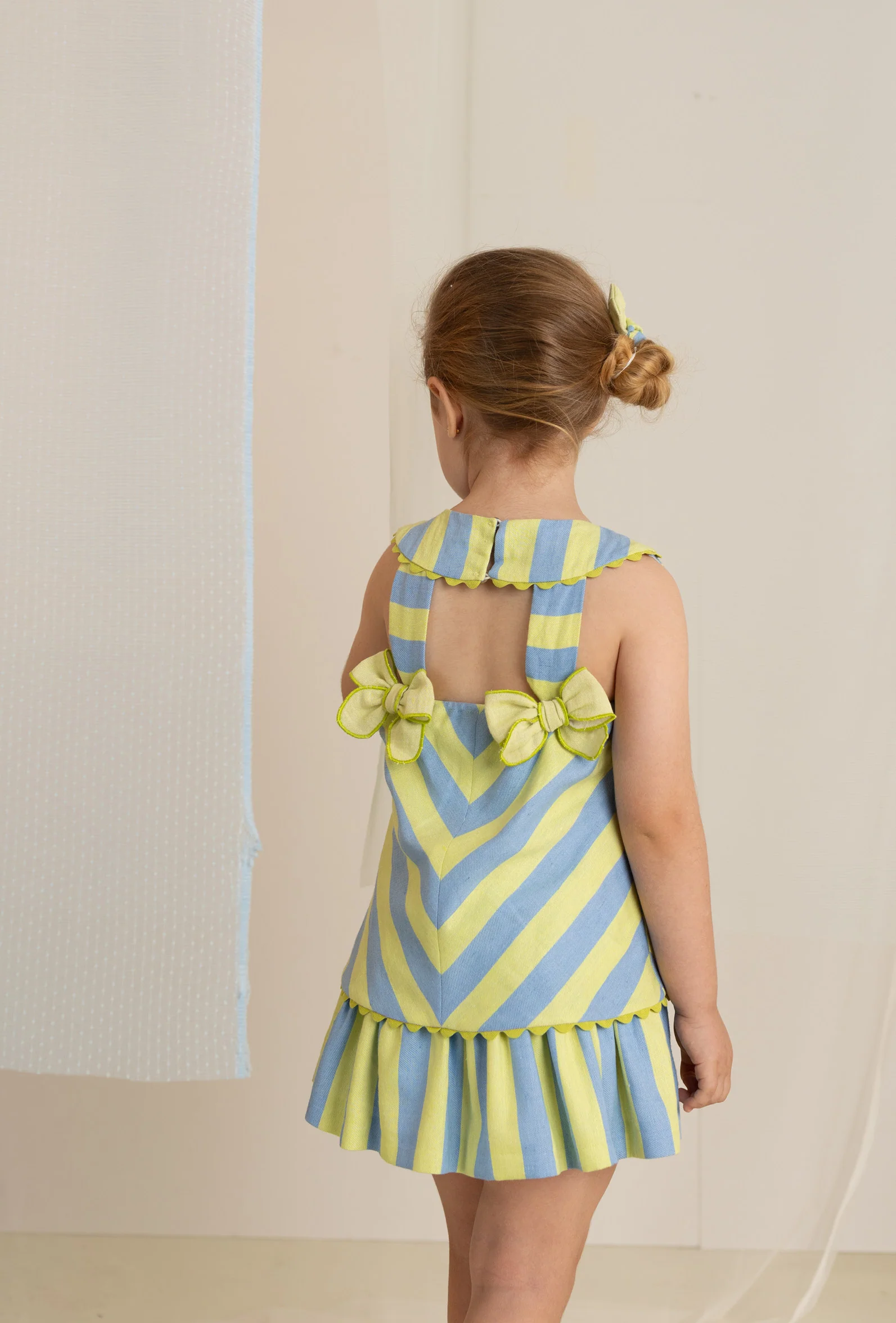💐 Vestido de Rayas verde y menta y celeste, con botón con apertura superior.
