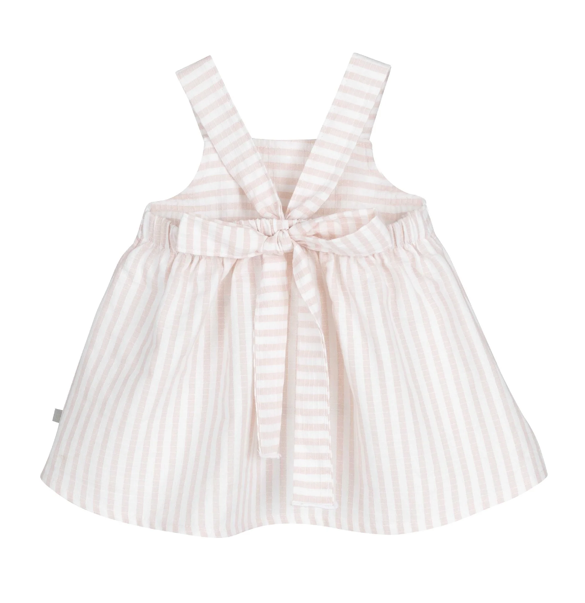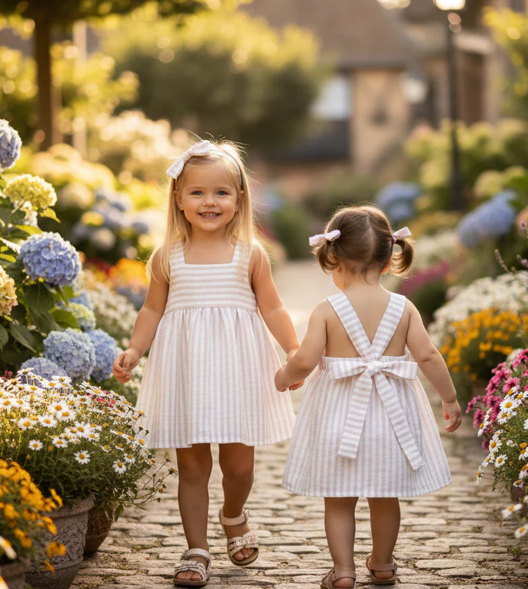 Vestido de Rayas con Lazo Trasero Estilo clásico renovado para las más pequeñas. Con un corte cómodo y fresco, este vestido cautiva por su espalda abierta con tirantes cruzados y su gran lazo decorativo. Un imprescindible de temporada que une la sencillez de las rayas con un toque romántico irresistible.
