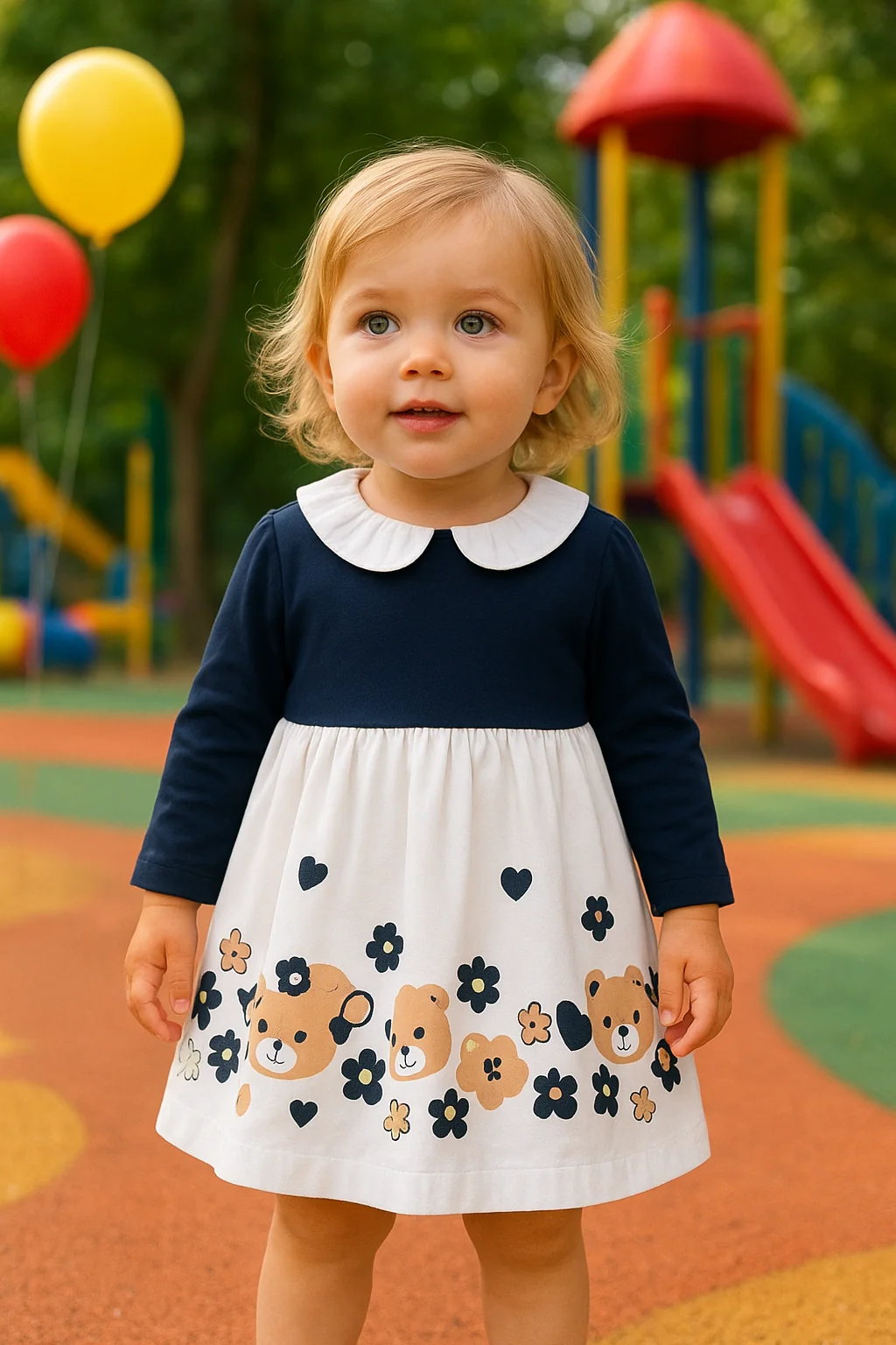En conjunto, el vestido combina la sobriedad del azul marino con la dulzura del estampado, creando una prenda perfecta para ocasiones especiales o salidas familiares, manteniendo siempre un aire infantil y encantador.