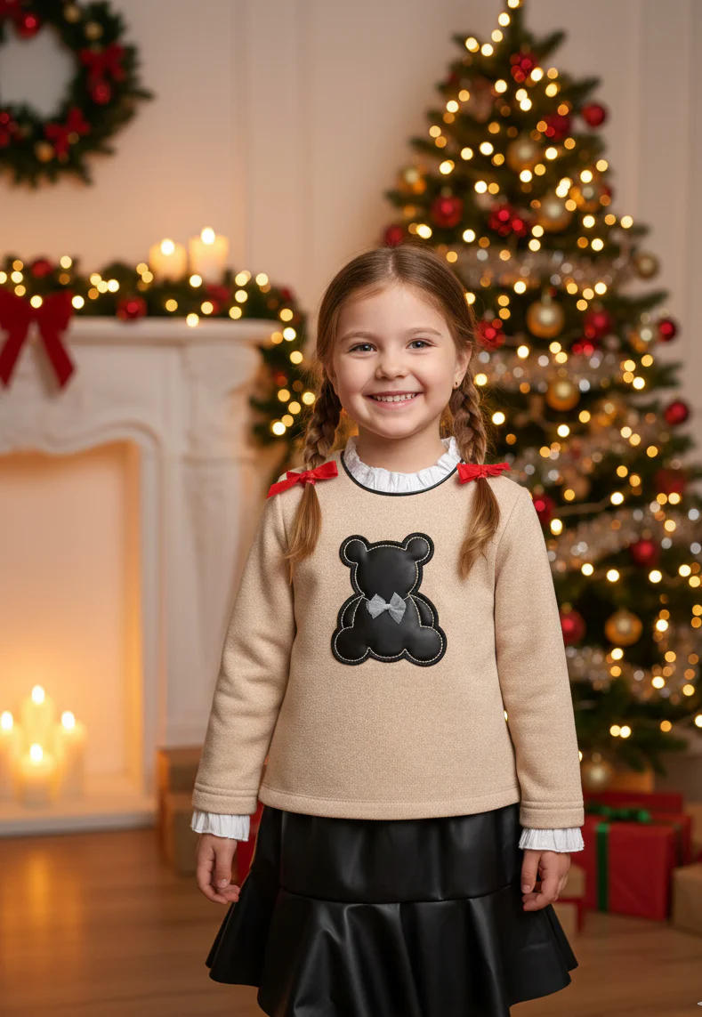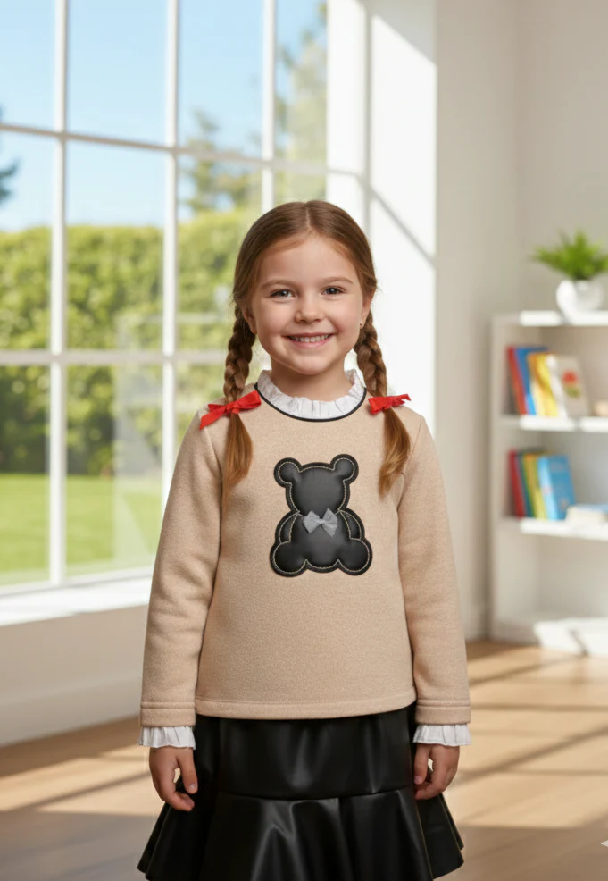 Detalle Central: Destaca un oso de peluche en relieve realizado en un material oscuro (posiblemente cuero sintético o terciopelo) con un pequeño lazo plateado al cuello.