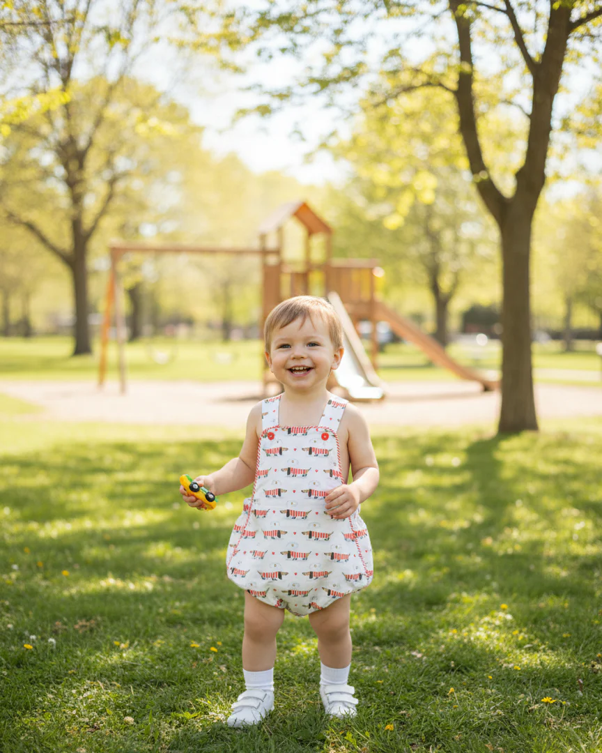 💐 Vestido de Cuadro Vichy Rojo, falda blanca con perritos, con botón con apertura trasera.