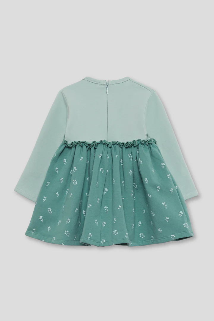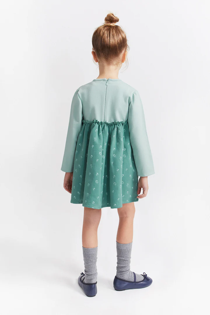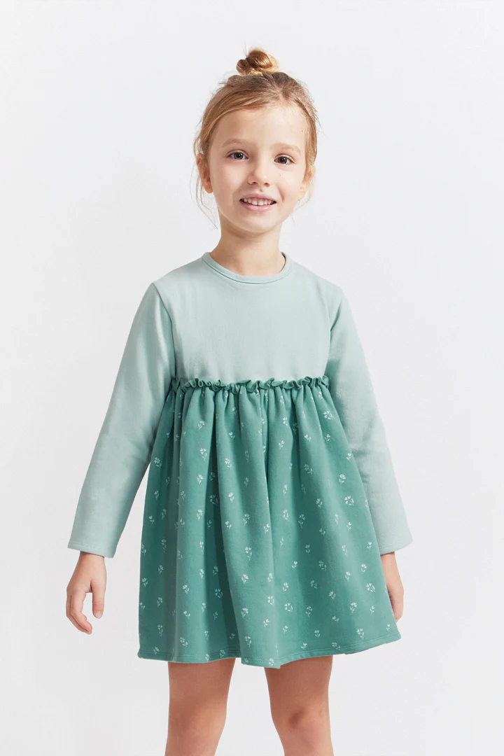 💚Este vestido de niña presenta un diseño encantador con una parte superior lisa de manga larga en un colore verde menta sueve. la parte de la falda es ligeramente mas oscuro esta adornado con un estampado de ligeras flores blancas y fruncido en la cintura para darle volumen y movimiento. Es una prenda cómoda para el día a día 💚