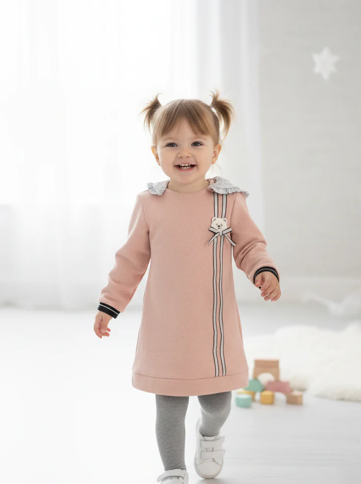¡Luce con estilo desde pequeñ@! 💫 El Vestido El Louvre es pura ternura: vestido de color Rosa con cuello bebé 🤍, y delicados volante blanco ✨. Un look cómodo, calentito y elegante 🧁👗
