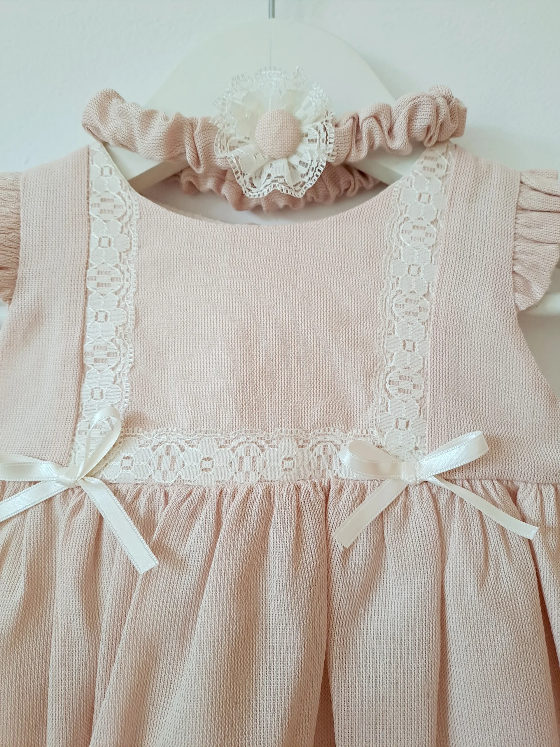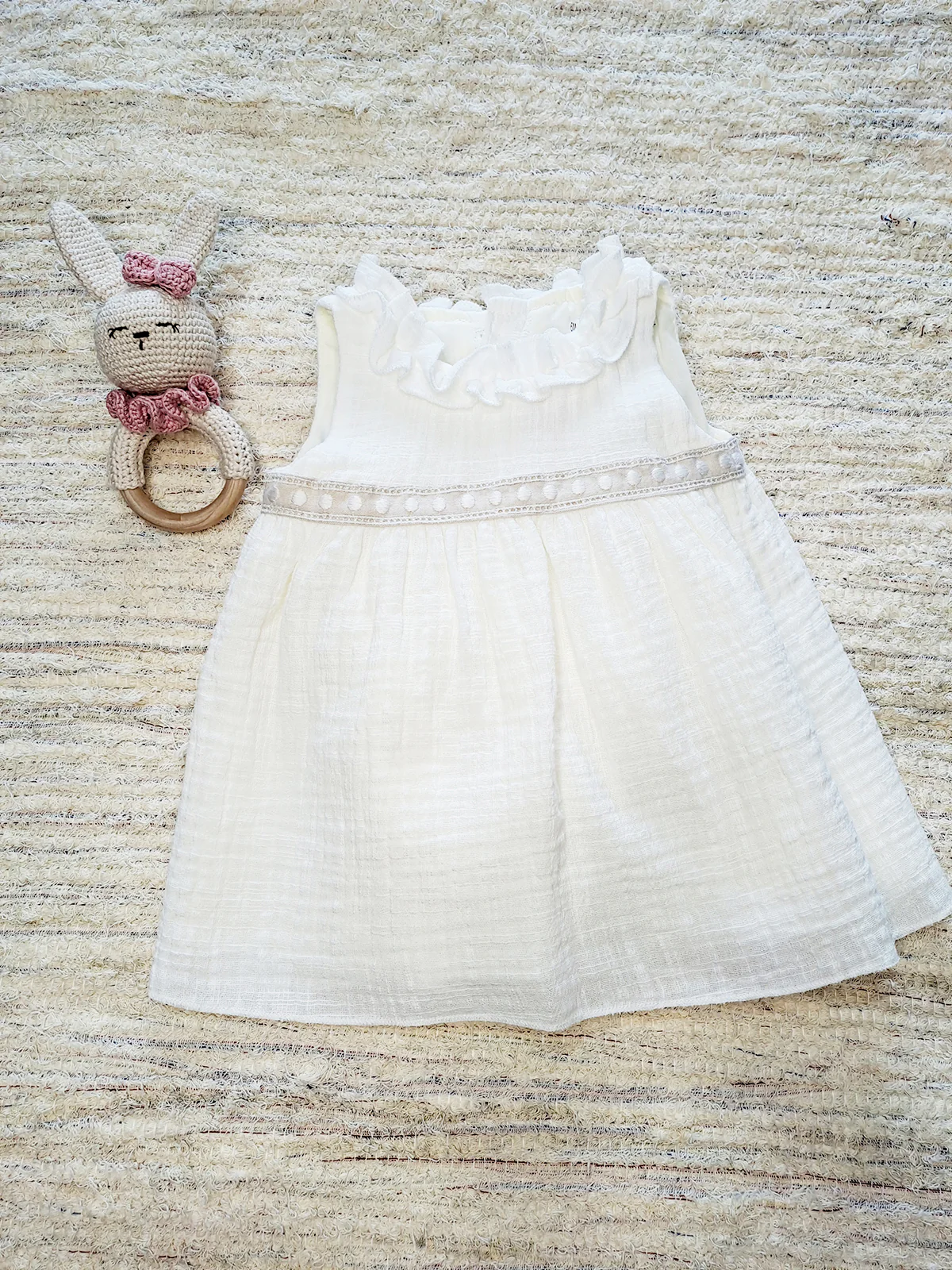 El vestido es de corte A, sin mangas, con pequeños volantes o fruncidos delicados sobre los hombros.