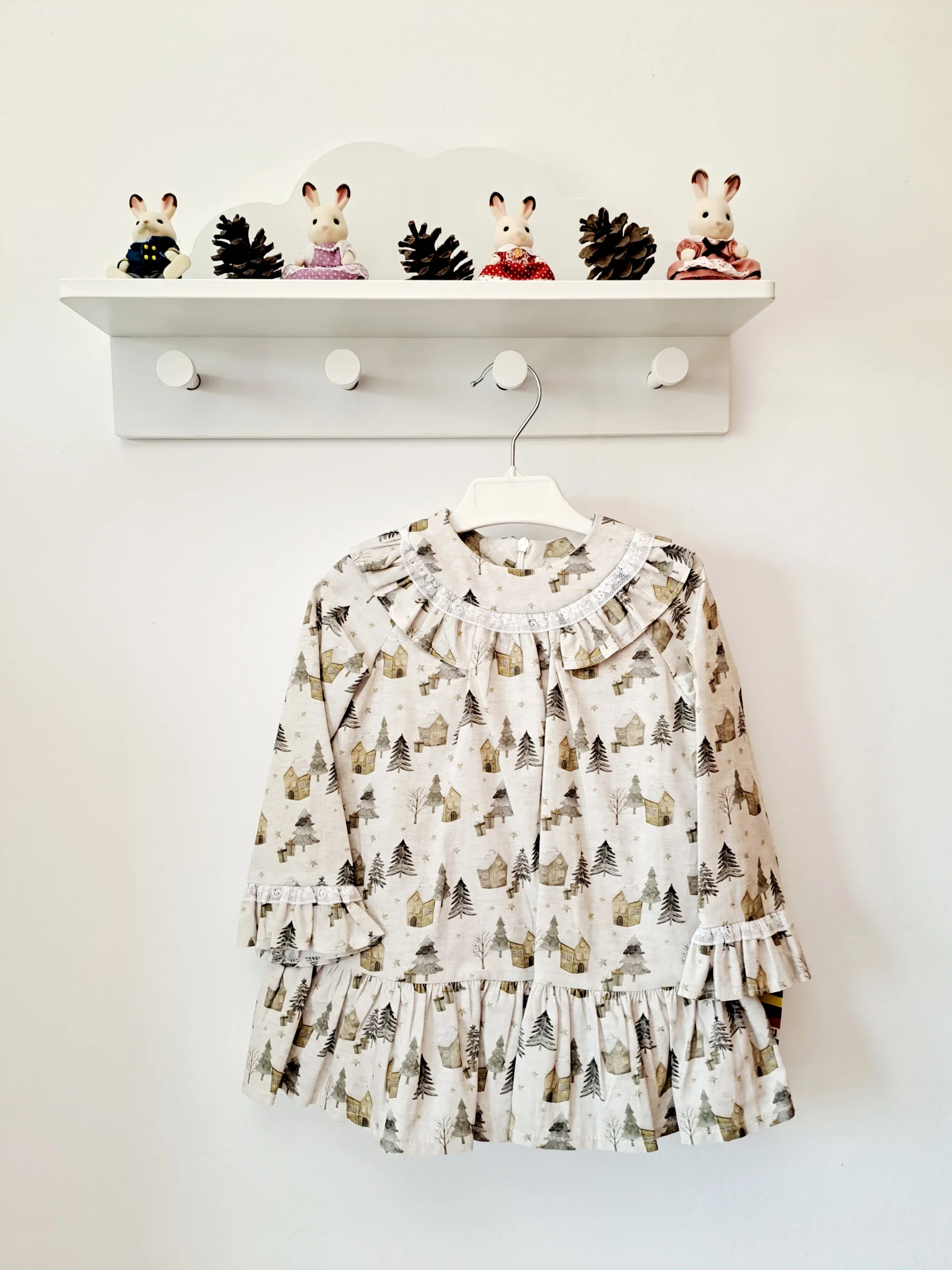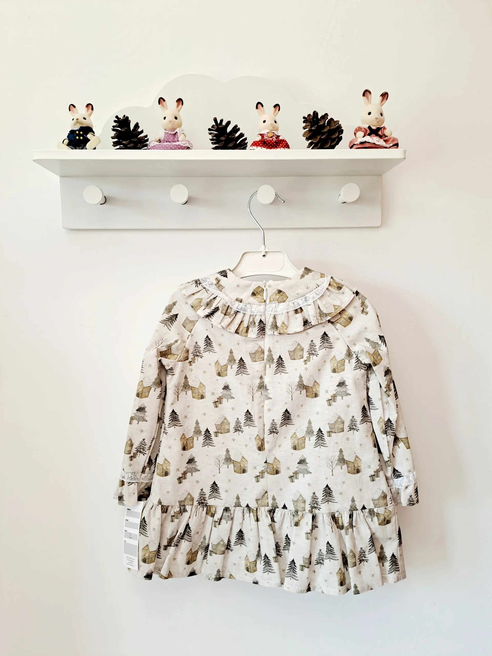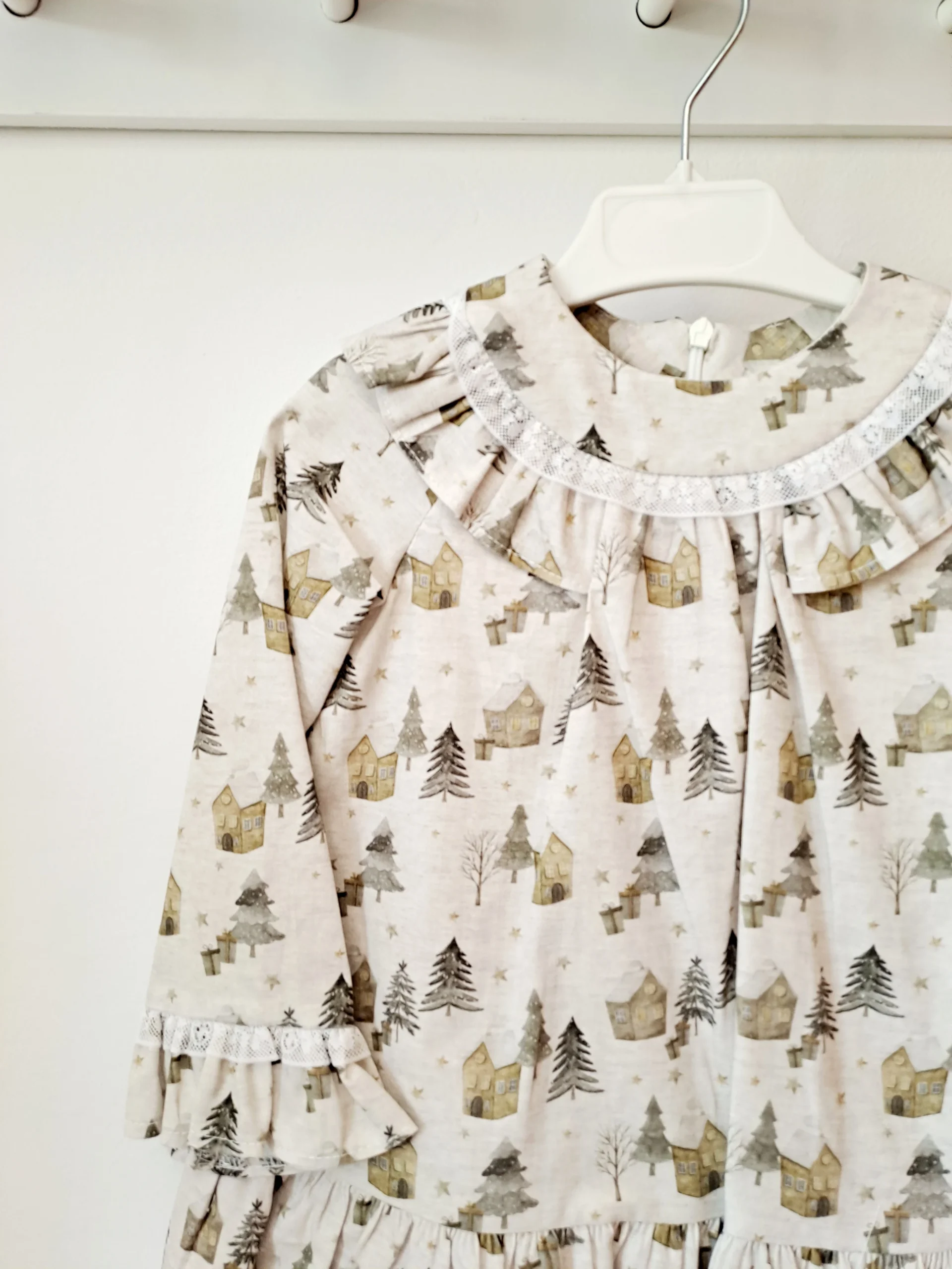 Vestido de estampado de casitas en el pinar con volante en los cuello.