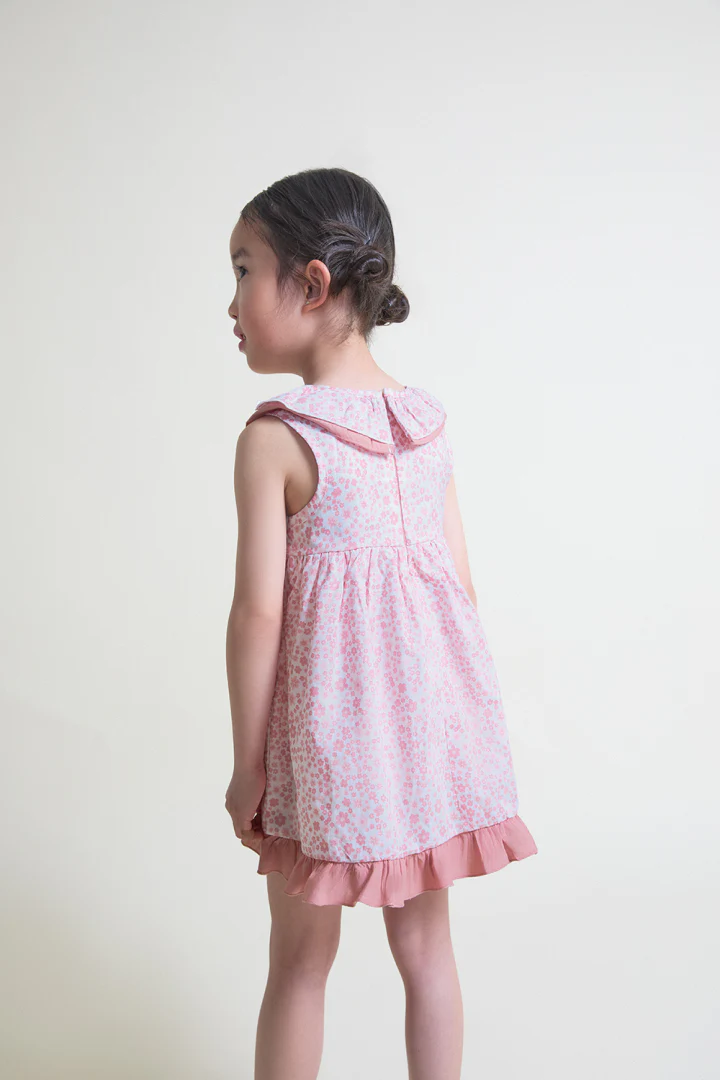 Vestido para niña de 3 a 8 años. Diseño sin mangas con estampado floral en tonos maquillaje. Presenta cuello volante doble con detalle a contraste, y lazo decorativo en la cintura que aporta un aire tierno y elegante. El bajo del vestido está rematado con franja lisa en color maquillaje, creando un acabado delicado y con movimiento. Cierre trasero con botones a presión para mayor comodidad. Confeccionado en tejido fresco y ligero, perfecto para los días de verano, ofreciendo estilo y comodidad en cualquier ocasión.