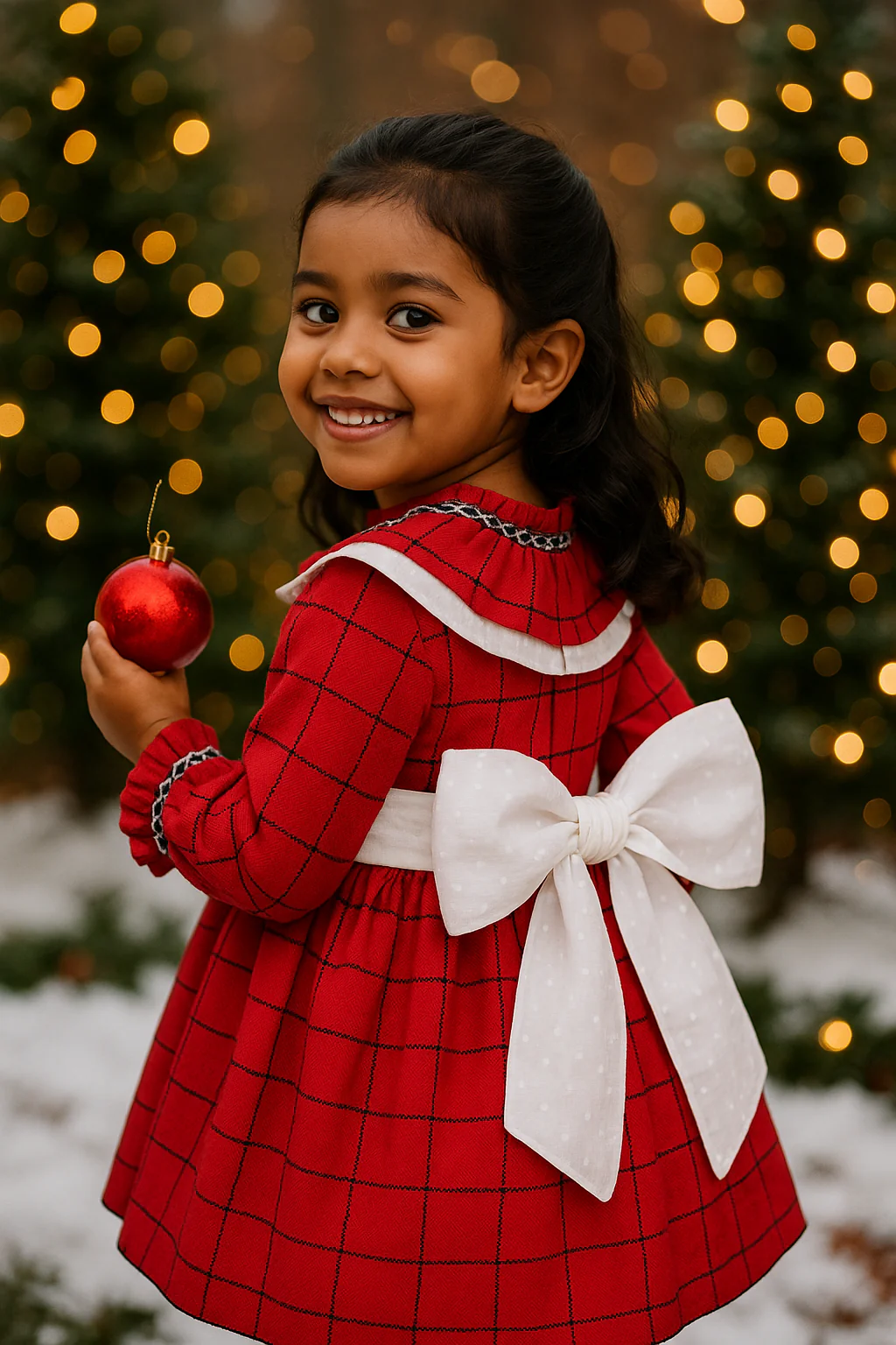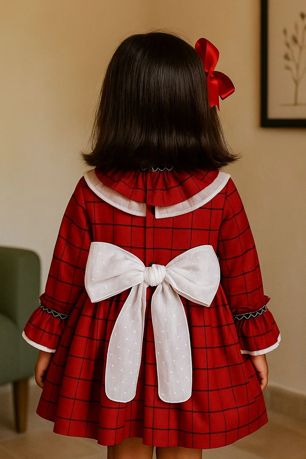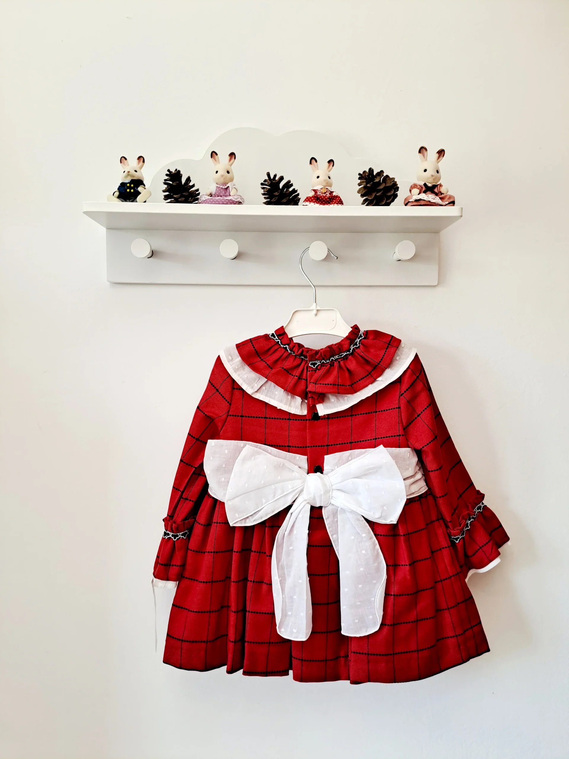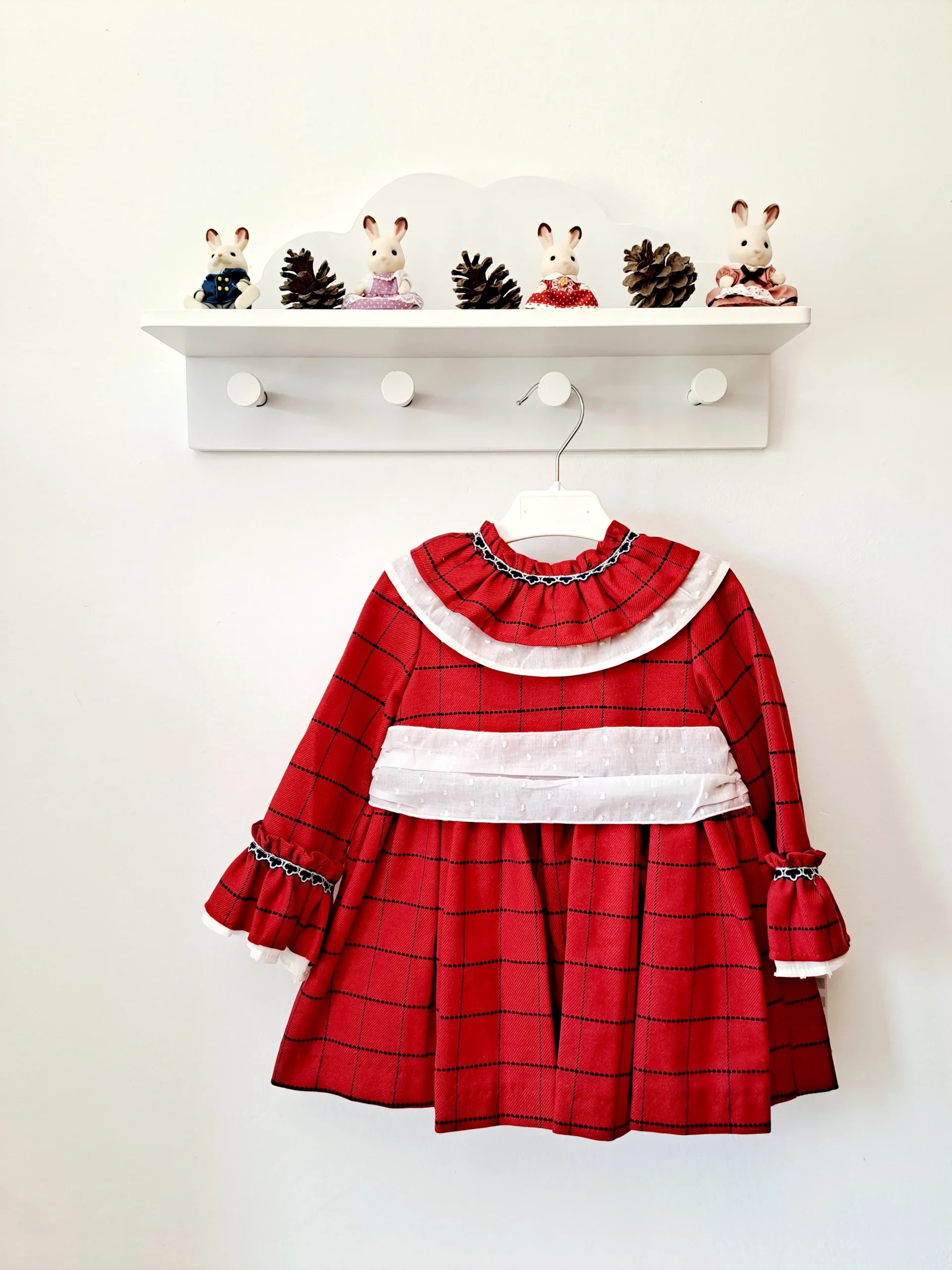 Vestido rojo de cuadros con cinturón blanco con volante en los cuello.