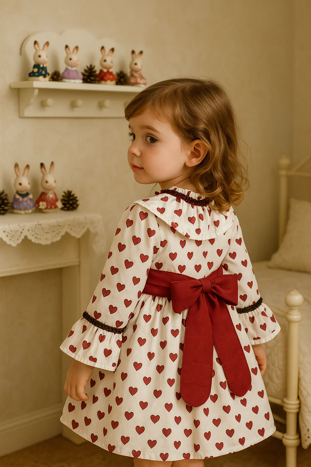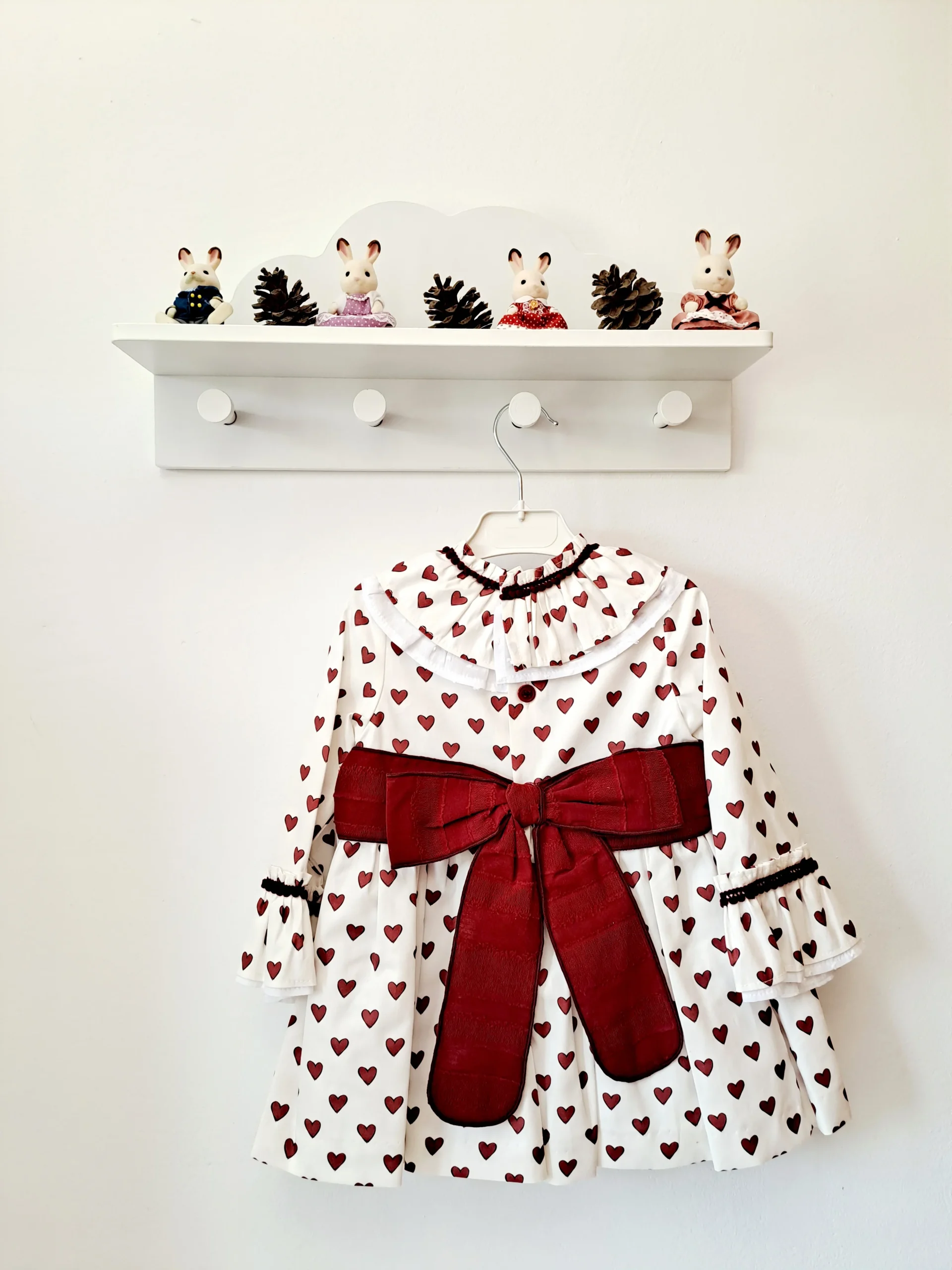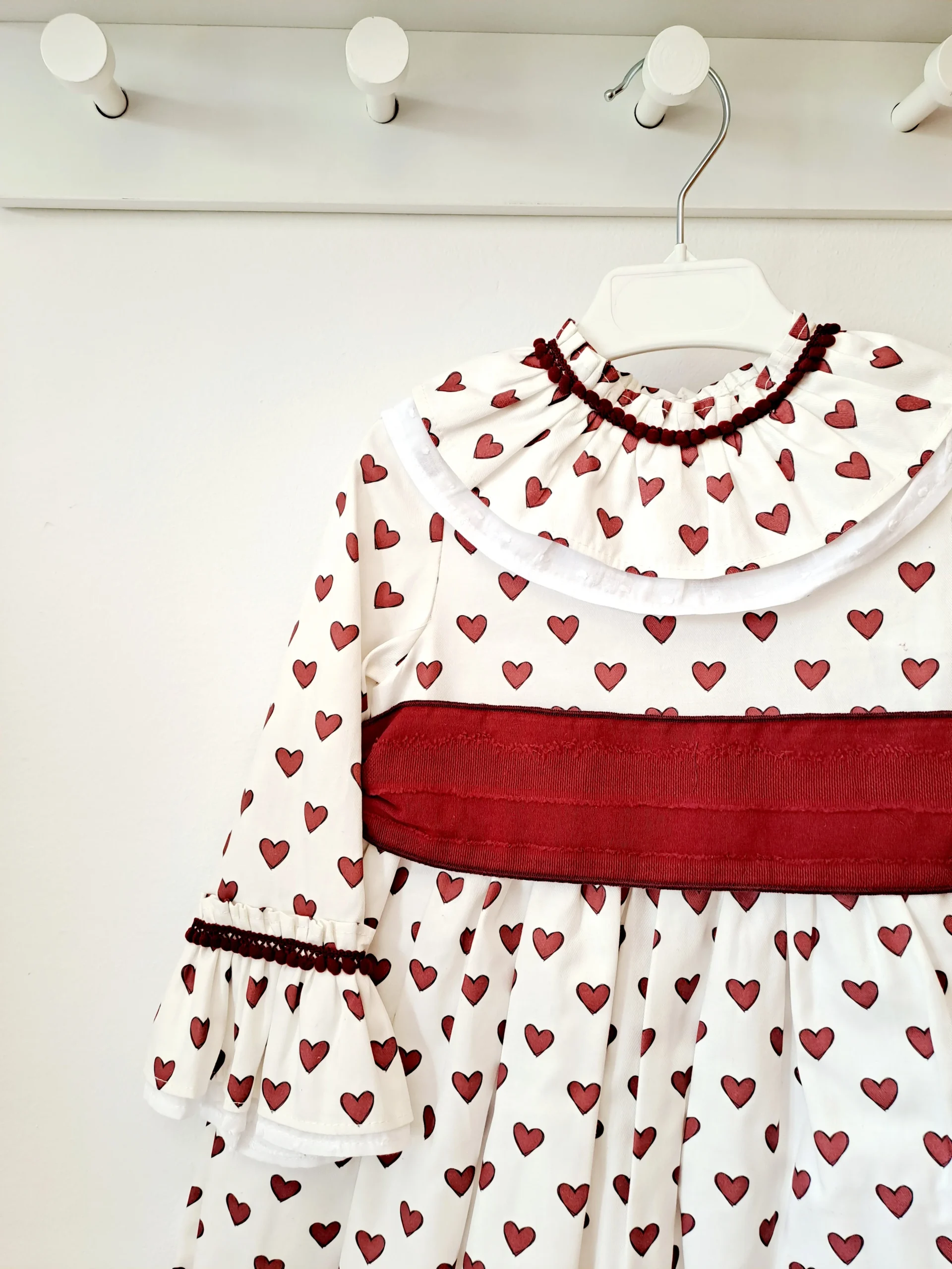Vestido de corazones con volante en el cuello y cinturón bourdeos con lazo en la espalda