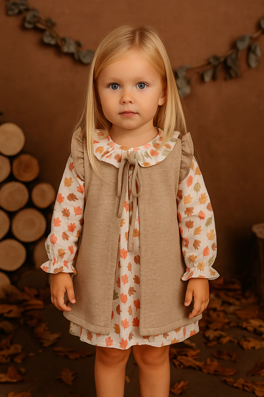 Vestido con chaleco abierto tierno y cómodo para bebé, ideal para el otoño. Incluye vestido manga larga con volantes y estampado de hojas, más chaleco.