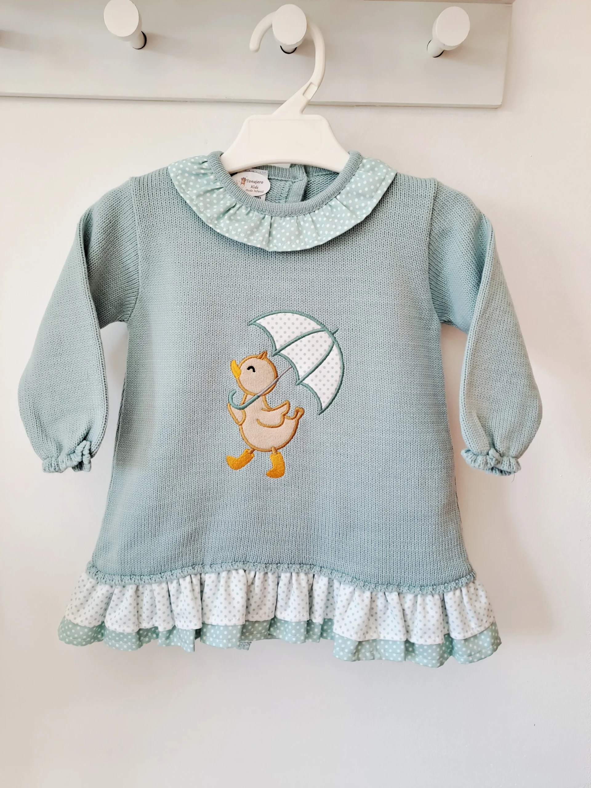 El vestido infantil de color verde empolvado con un diseño de un patito con un paraguas en el pecho, confeccionado en un material suave y cálido. Tiene botones traseros para facilitar su colocación,también diseñado para comodidad.