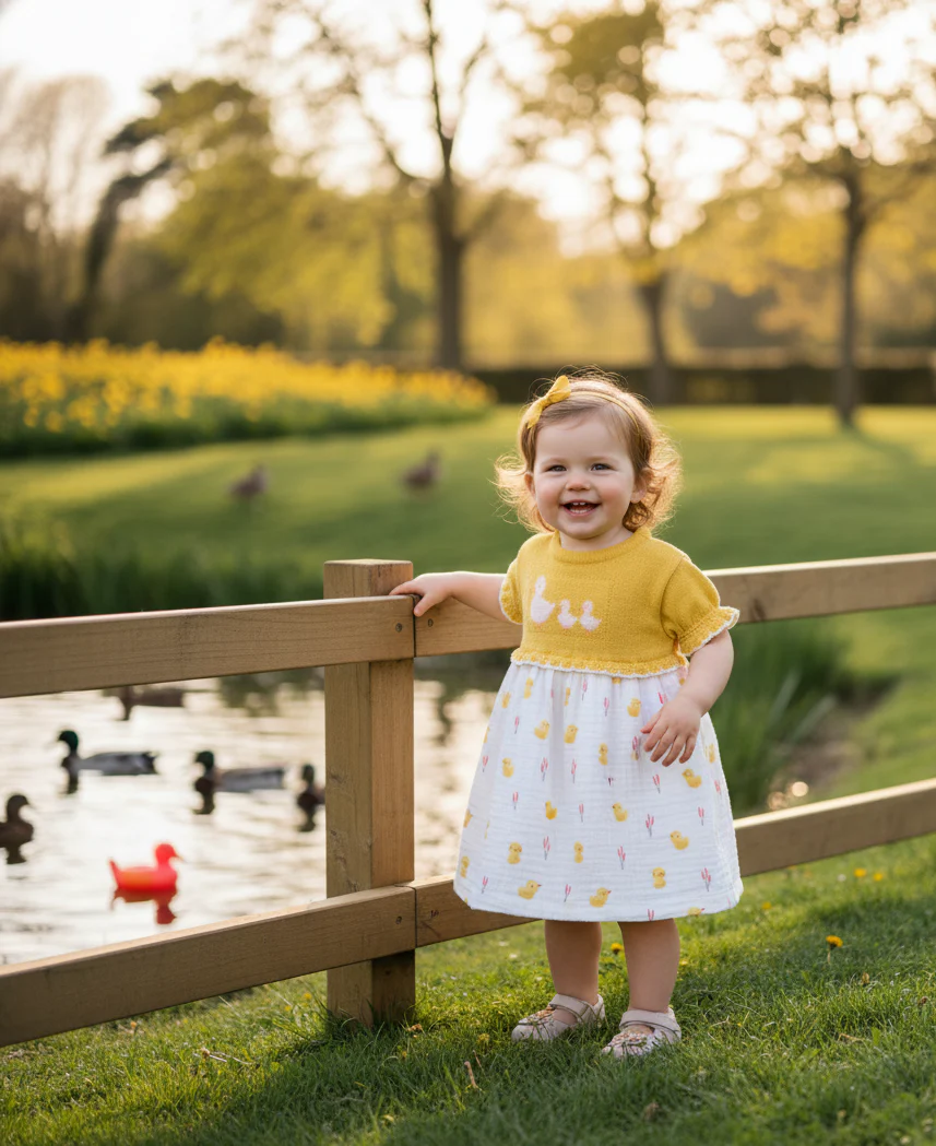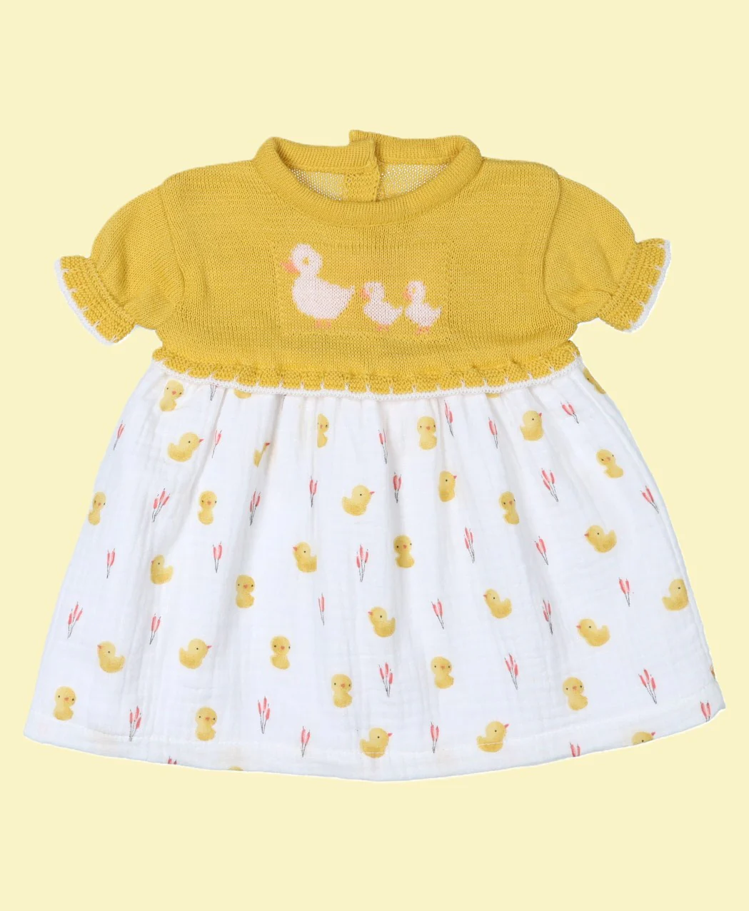 🪷 Vestido de hilo mostaza y mama pato con sus patitos, muselina blanca con mini patos , apertura trasera con botones. popys