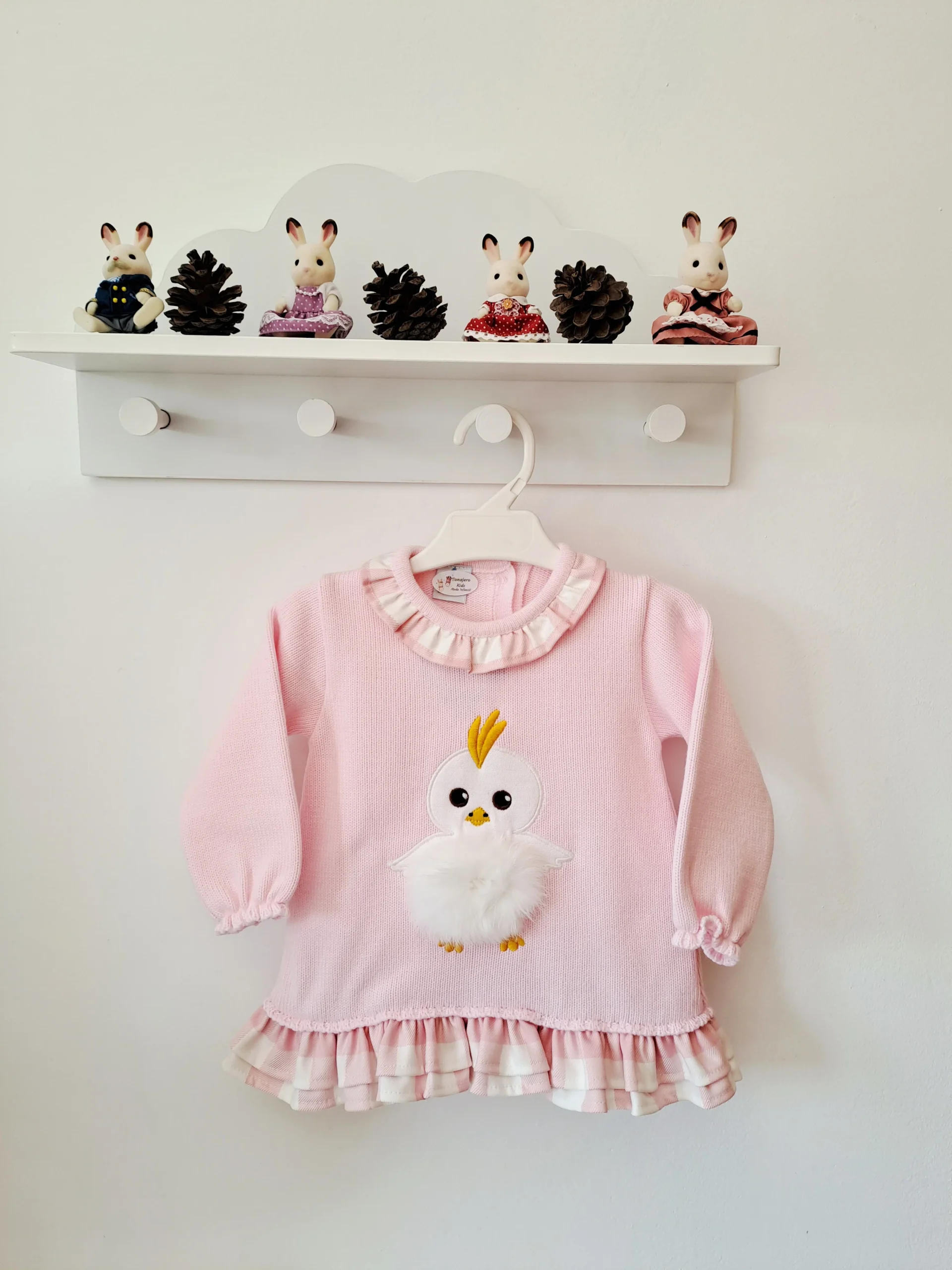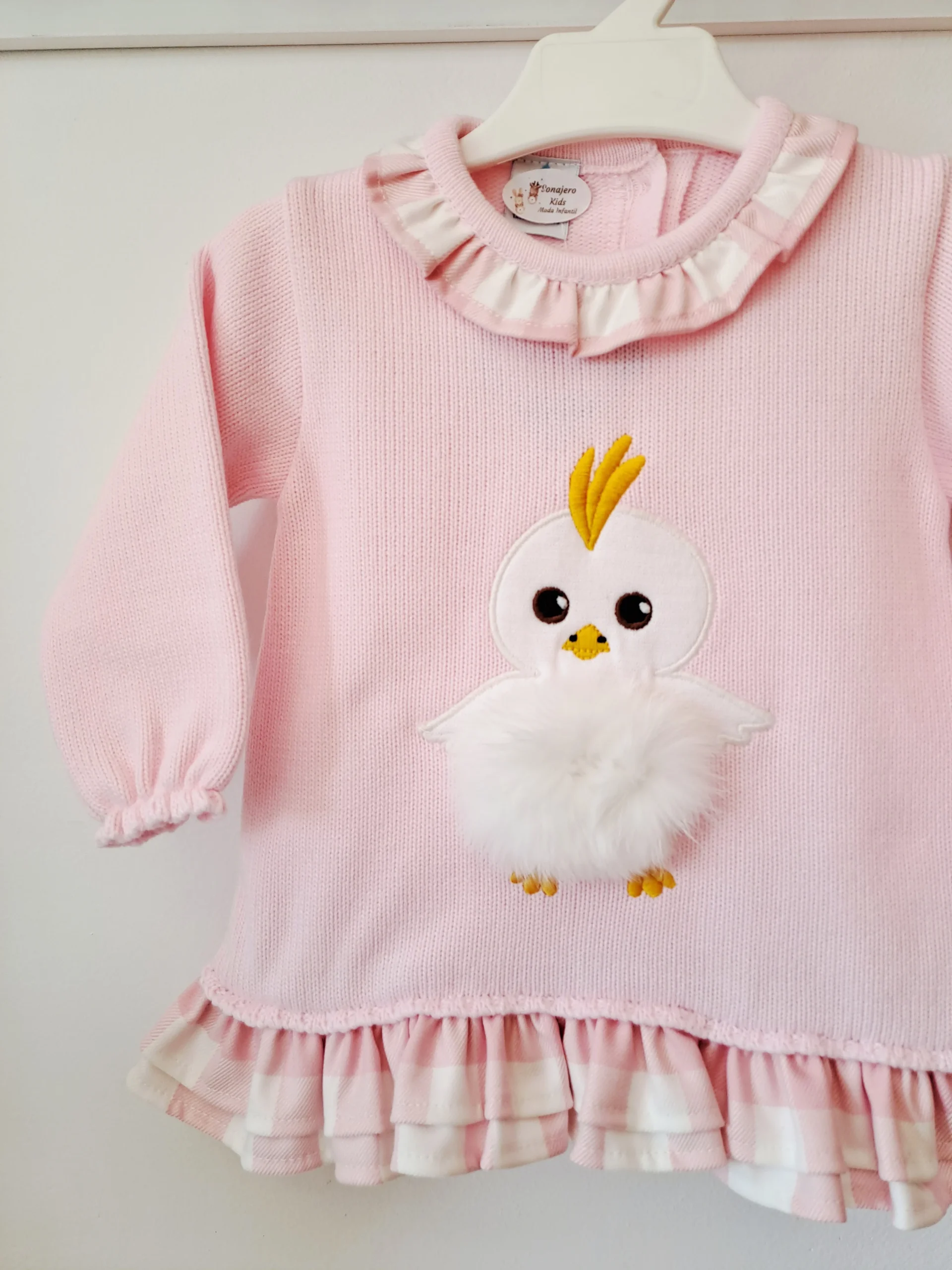 El vestido infantil de color rosa claro con un diseño de un pollito de peluche blanco en el pecho, confeccionado en un material suave y cálido. Tiene botones traseros para facilitar su colocación,también diseñado para comodidad.