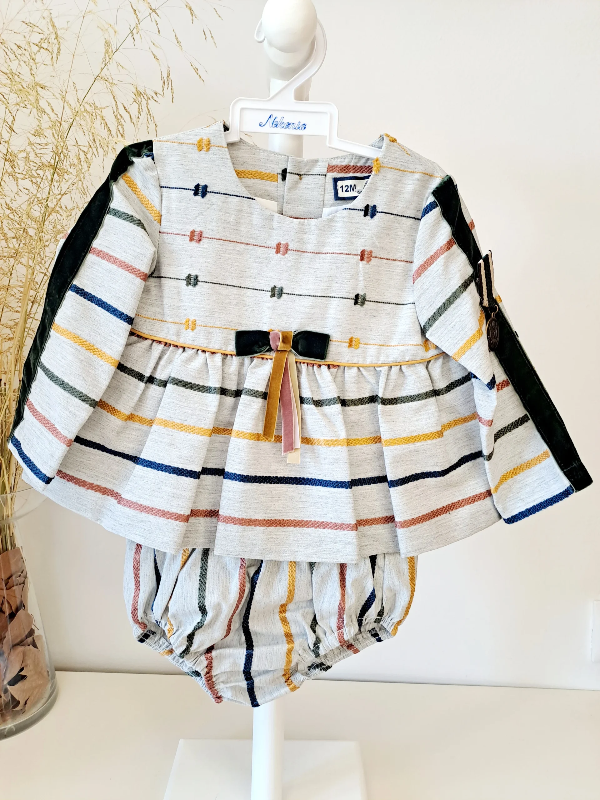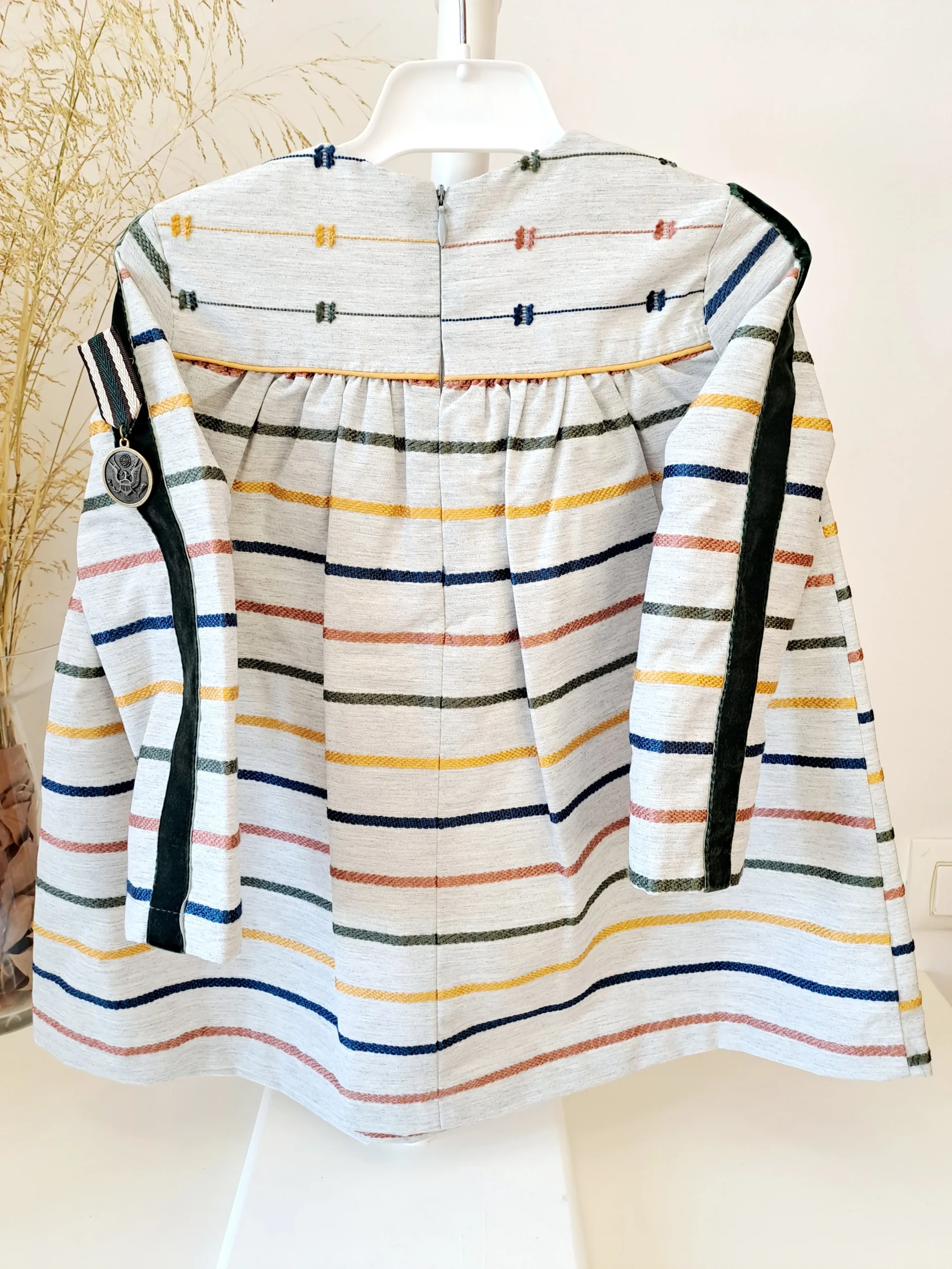Vestido de Nekenia diseño espectacular con detalle terciopelo en el filo de la manga, y aplique