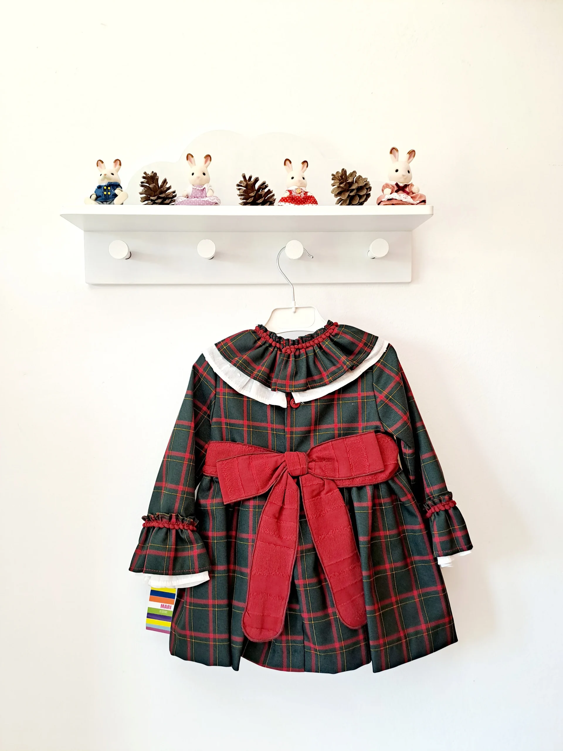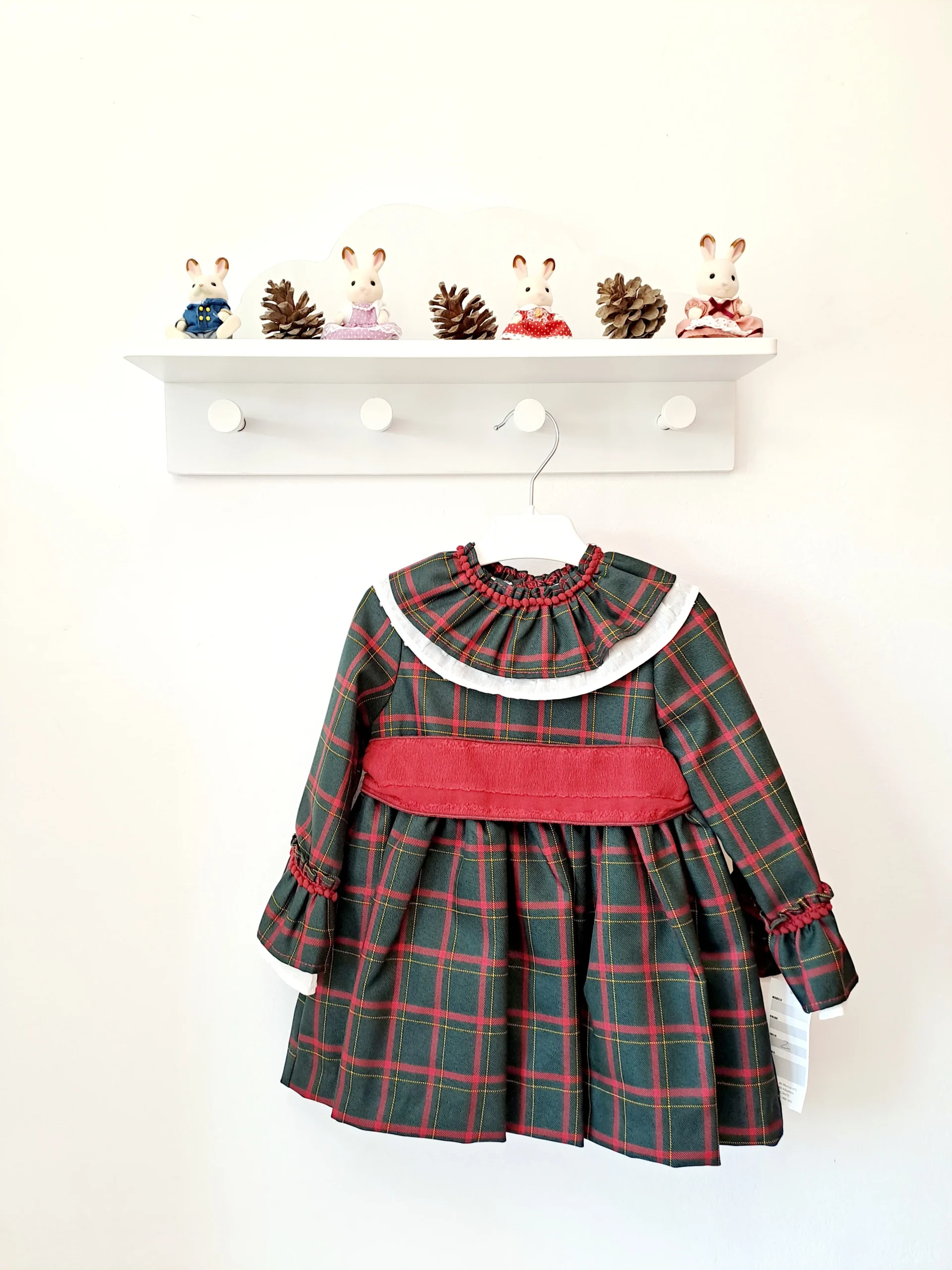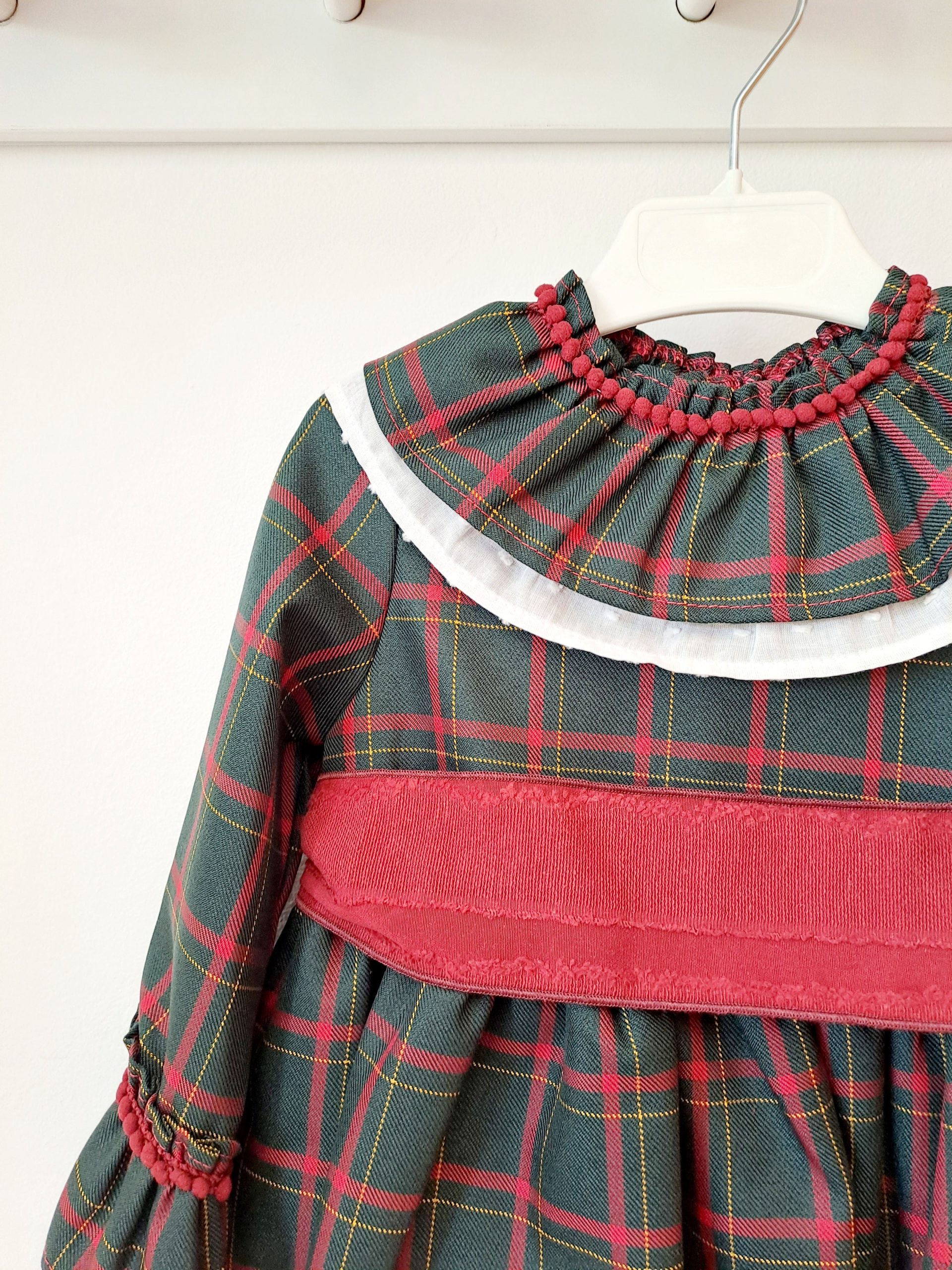 Vestido de estampado de cuadro escoces con volante en los cuello y cinturón bourdeos.