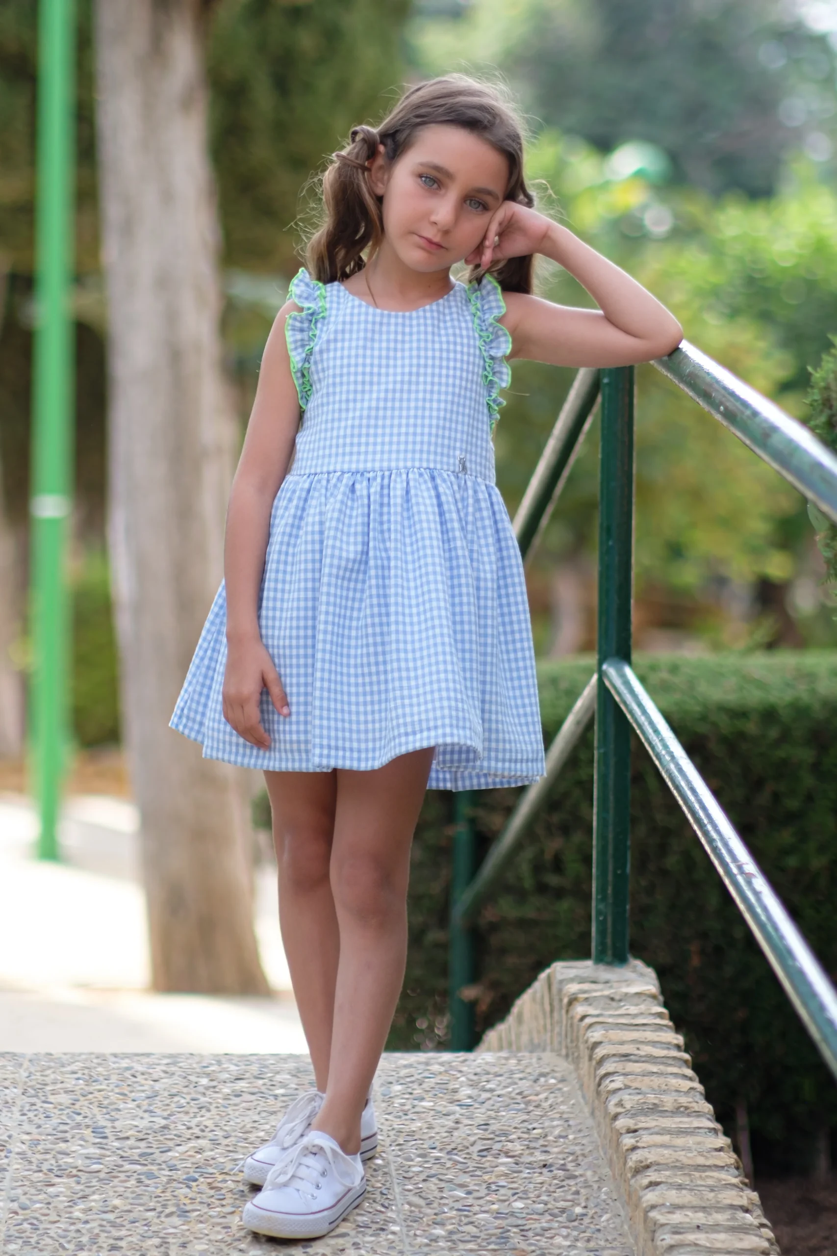 💙 Vestido cuadro vichy Celeste decorado con perfilado verde en el volante de hombro y espalda cruzada.🩵