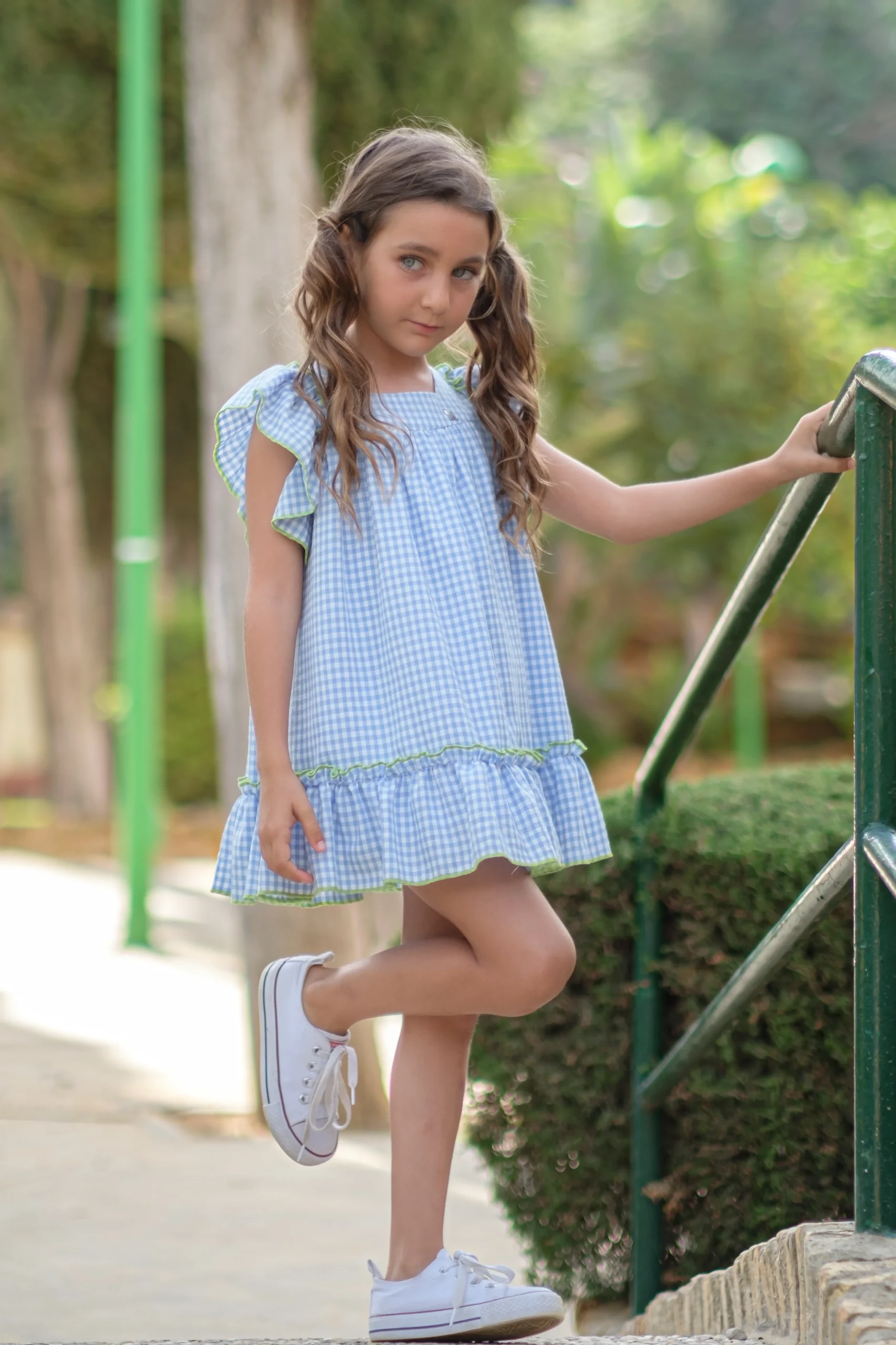 💙 Vestido cuadro vichy Celeste decorado con perfilado verde, espalda con lazo moña.🩵