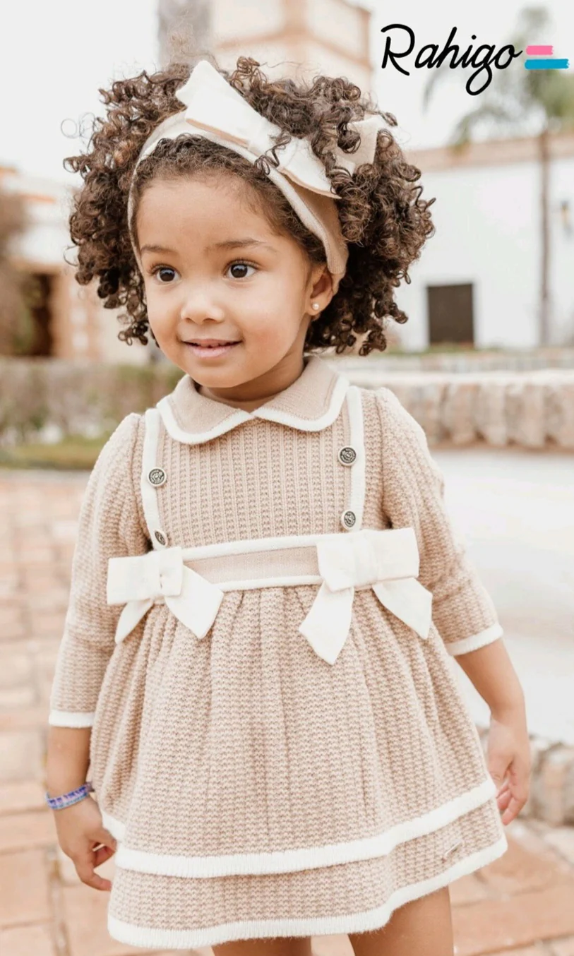 Vestido talle alto con volantes de punto en el cuello y lazo de punto, terminado en dos volantes de
