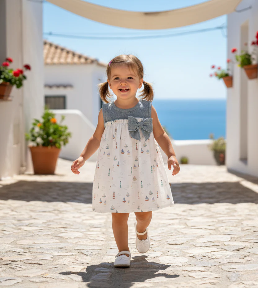 Este es un vestido infantil de estilo marinero, diseñado con un corte cómodo y fresco. Sus características principales son: